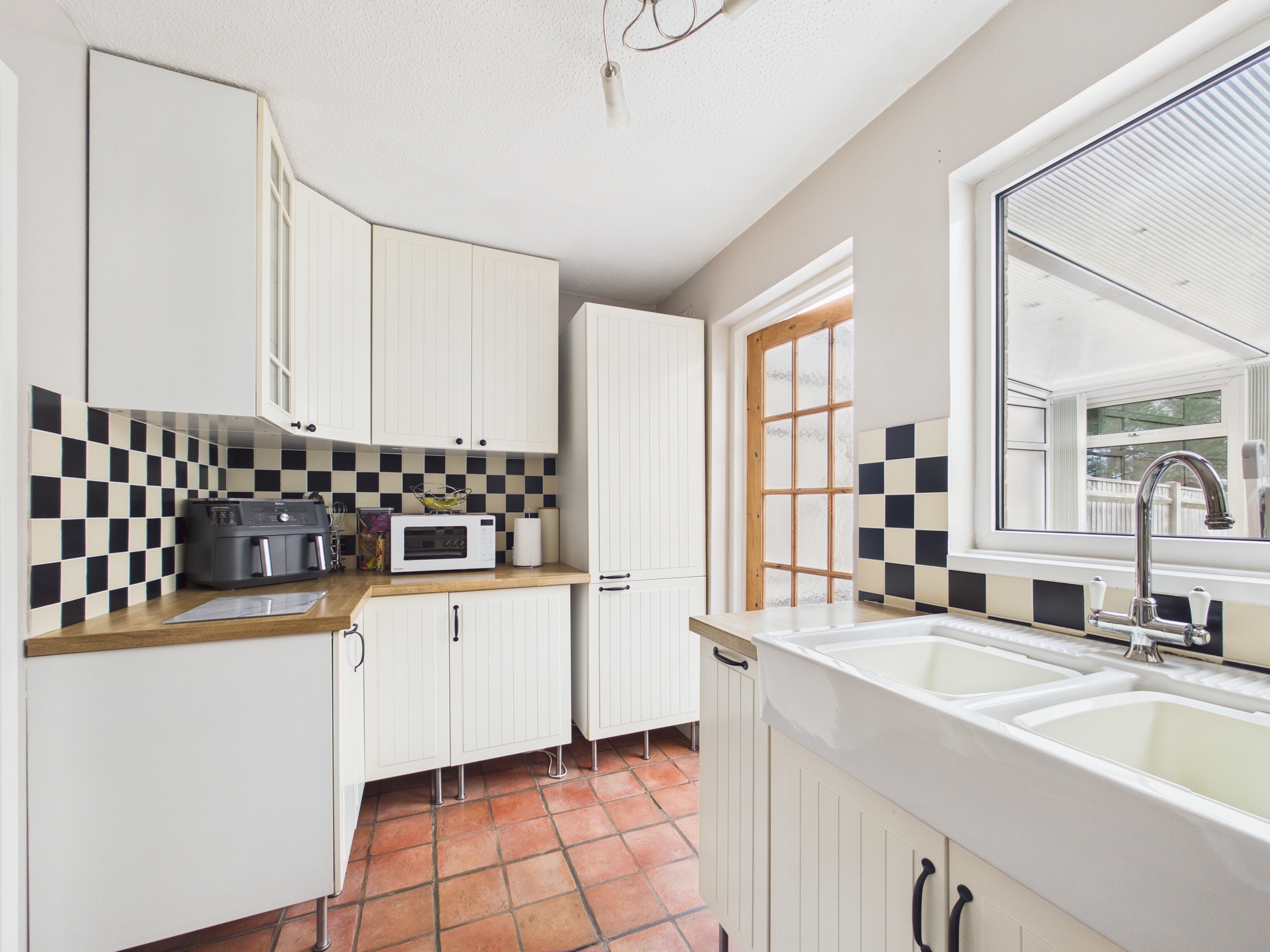 The delightful cottage style kitchen is finished in neutral tones with quarry tiled flooring. Comprising a range of matching wall and floor mounted units with a worksurface over, this lovely kitchen is sure to prove popular with culinary enthusiasts. There is space for a range cooker with an extractor hood above, an integrated fridge/freezer and a double bowl butler sink. The conservatory is of UPVC construction on a dwarf brick wall with a glazed roof. Windows to the side and rear aspects offer views over the garden. French doors open out to an area of raised decking connecting indoor and outdoor living.
