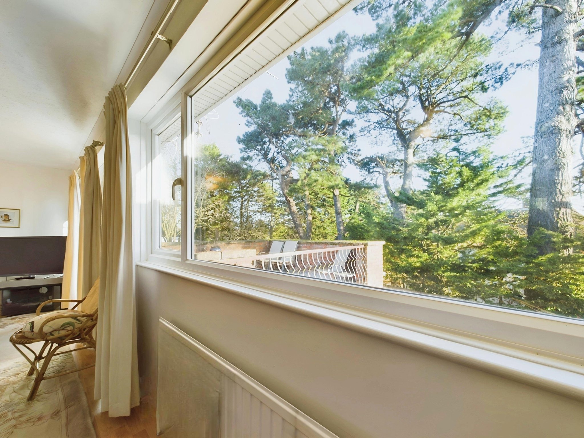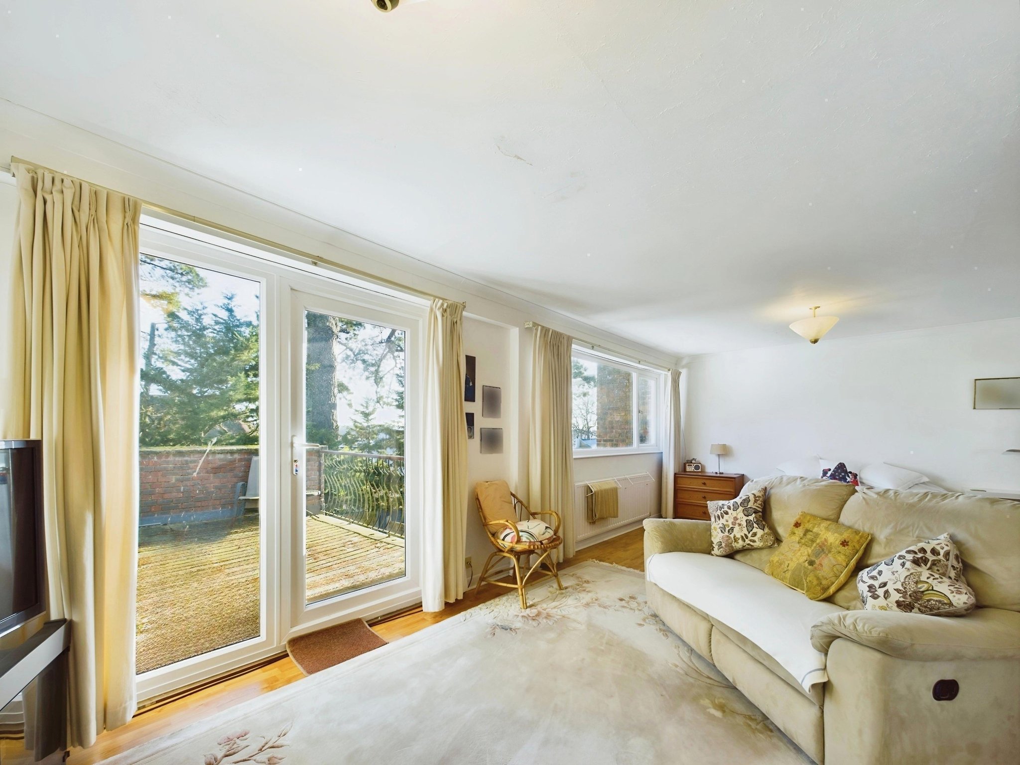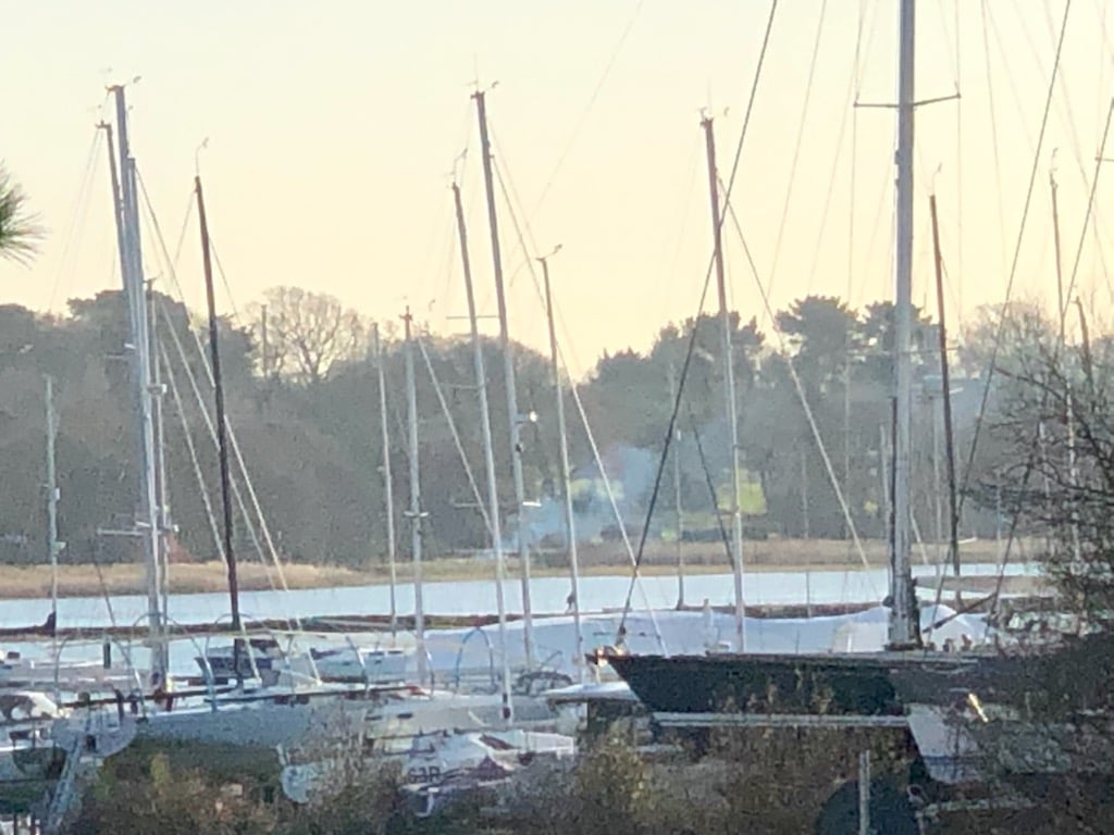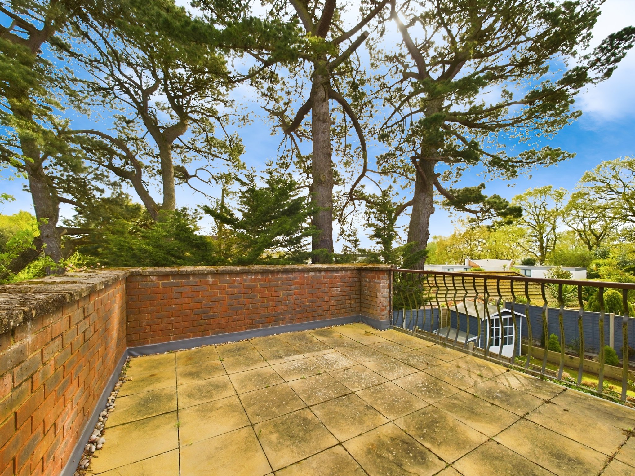 sleeping quarters to one side, which includes two fitted wardrobes, and a relaxation area to the other. This area boasts a full-length window a door opening onto the generously-sized balcony. Enclosed by walls to two sides and with an open balustrade to the other, from this elevated position you are treated to views of the rear garden and the River Hamble beyond.