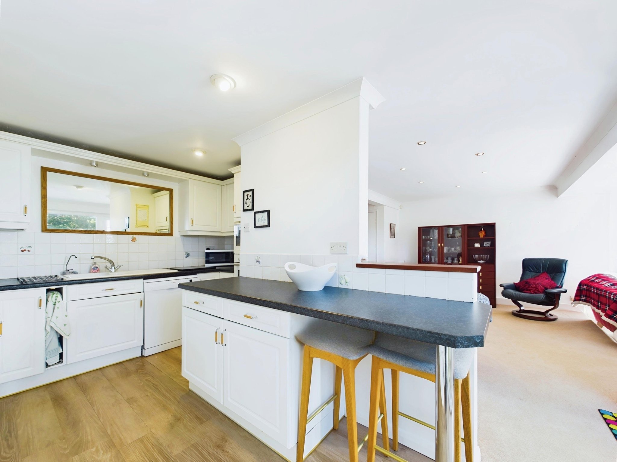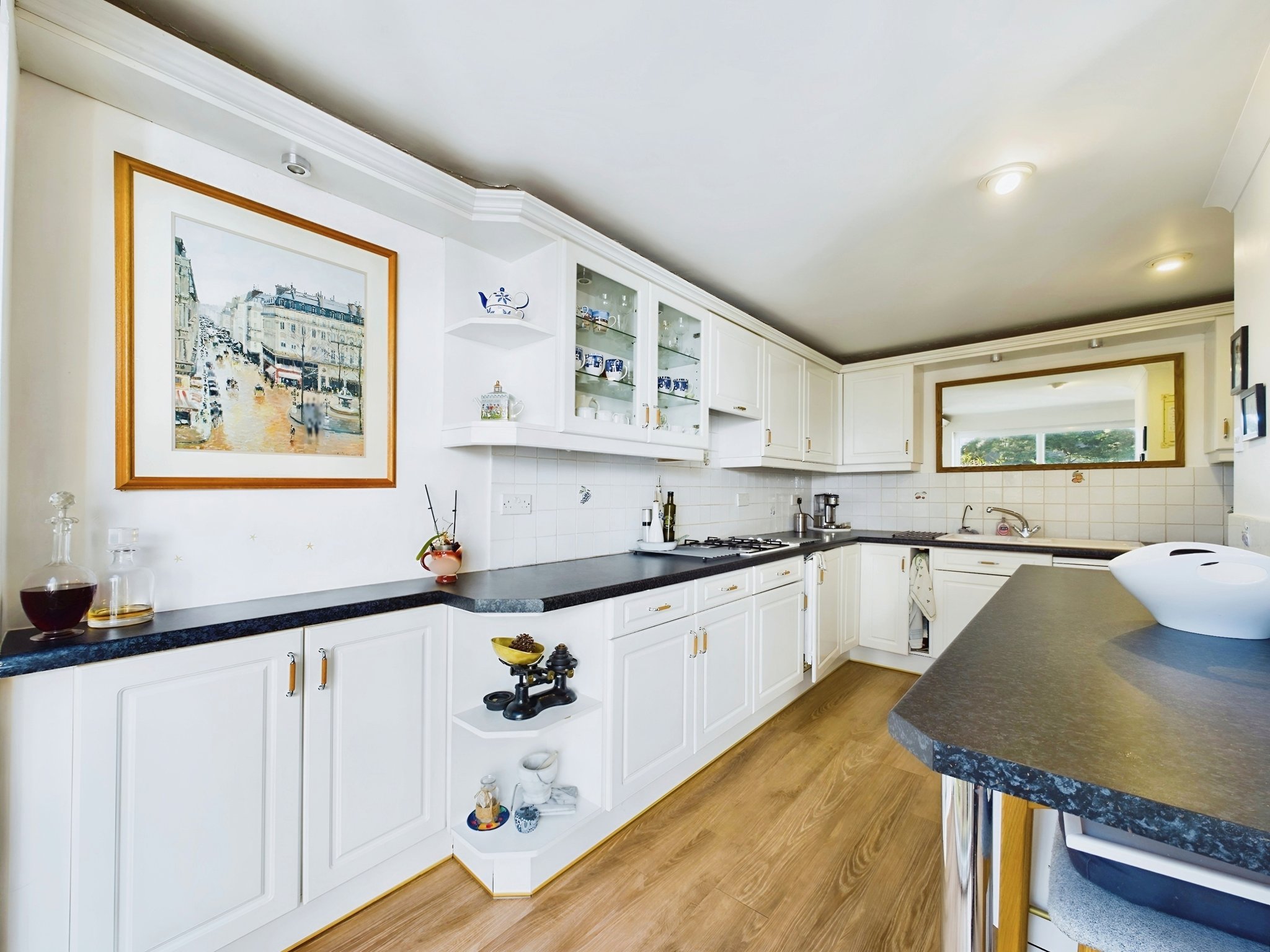 The kitchen comprises of a range of wall and floor mounted units with a roll top worksurface over. Including a built-in oven, microwave, integrated fridge, gas hob with an extractor hood over, there is also additional appliance space. There is a 1½ bowl sink and drainer with a white tiled splashback. A handy breakfast bar overlooks the dining area making this a perfect place to gather as a family or socialise.