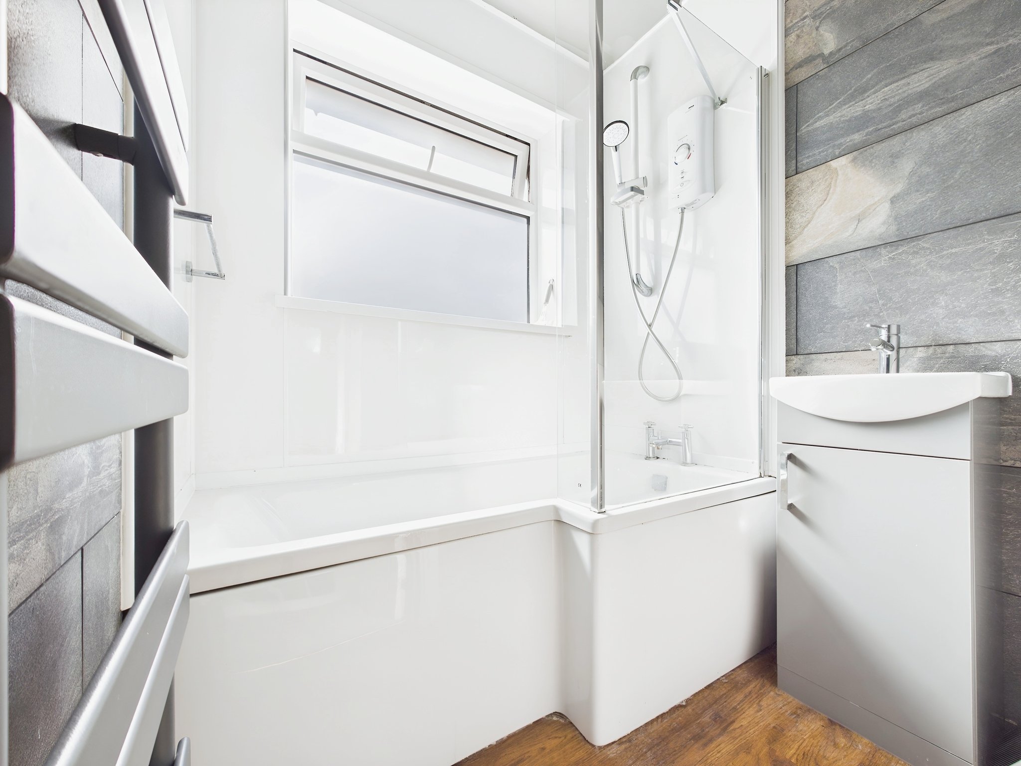 The contemporary bathroom boasts tiled walls and presents a side elevation obscured window. The suite comprises a p-shaped panel enclosed bath with an electric shower over and a wash hand basin with a vanity unit beneath.