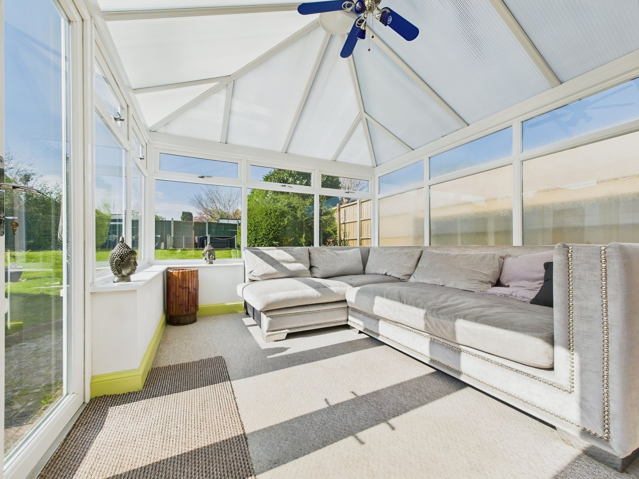 Doors from the dining area open into the conservatory, offering an extension of the living space. The conservatory is of UPVC construction on a dwarf brick wall, with a glazed roof and windows to three sides. French doors open onto the patio.