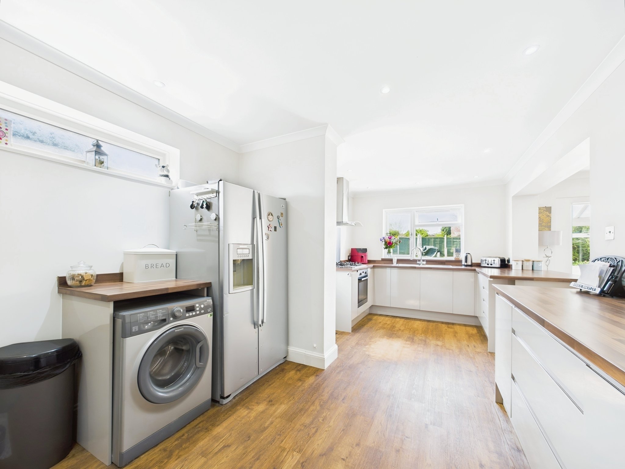The modern kitchen will prove popular with culinary enthusiasts and comprises a comprehensive range of base units with a worksurface over. Appliances include a five-burner gas hob with an extractor hood above, an electric oven, space for an American style fridge/freezer and space for a washing machine. There is a side elevation window and a window to the rear aspect providing views over the garden. A side door opens to the outside under a covered porch.
