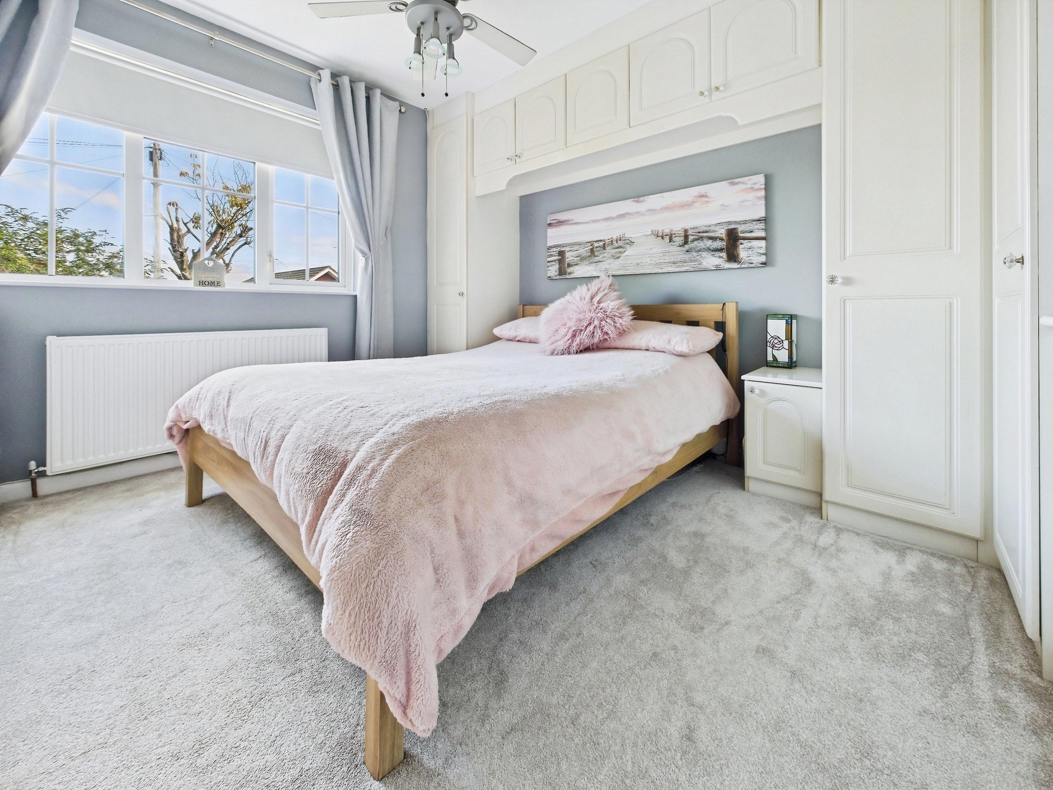 Bedroom one is a well-proportioned double room with a front elevation window and a fitted furniture system comprising wardrobes, overhead lockers and a vanity unit with sink.
