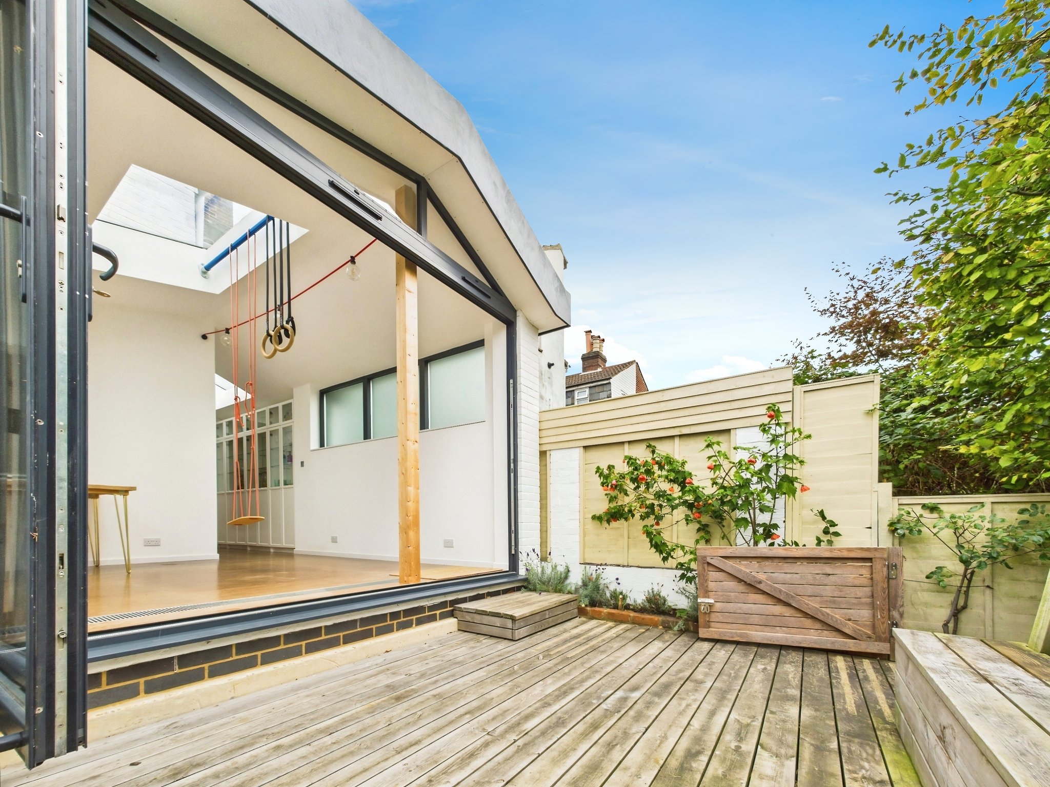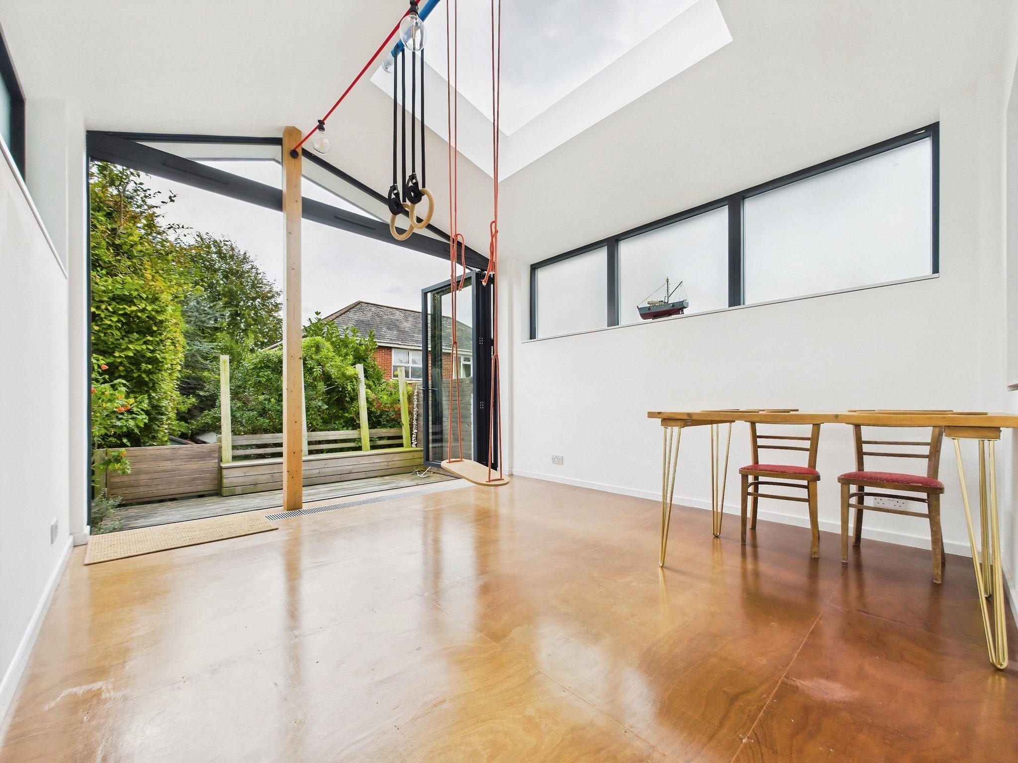 The family room is a beautiful light and airy space, perfect for socialising, with bifold doors opening directly onto the decking area. A skylight window allows additional natural light into the room.
