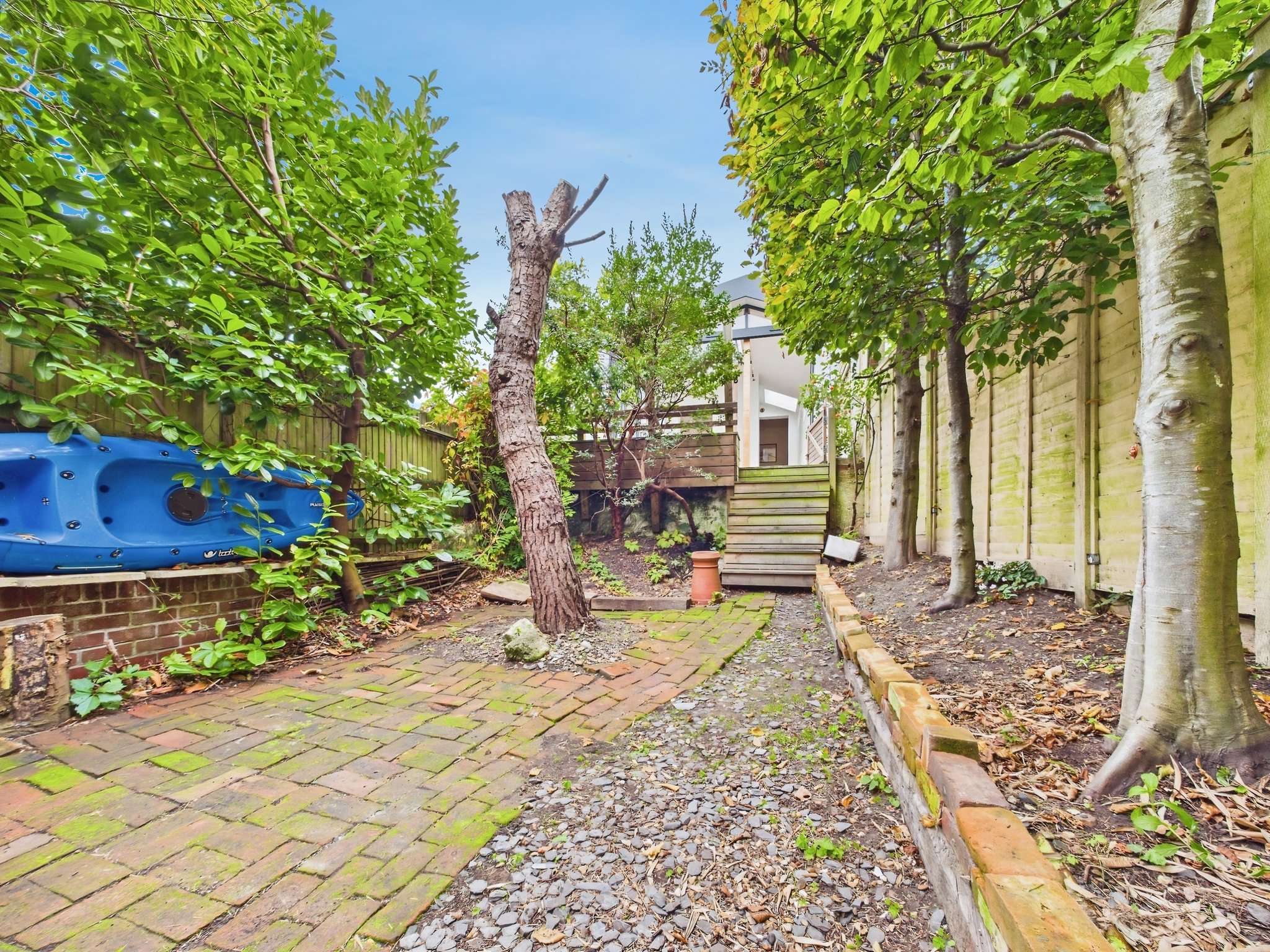 The split-level rear garden is enclosed by timber fencing. A raised decked terrace, accessed from the family room offers an lovely spot for al fresco dining. Steps lead down to the low maintenance garden area which is predominately paved and contains various trees and shrubs. At the foot of the garden are two timber storage sheds.