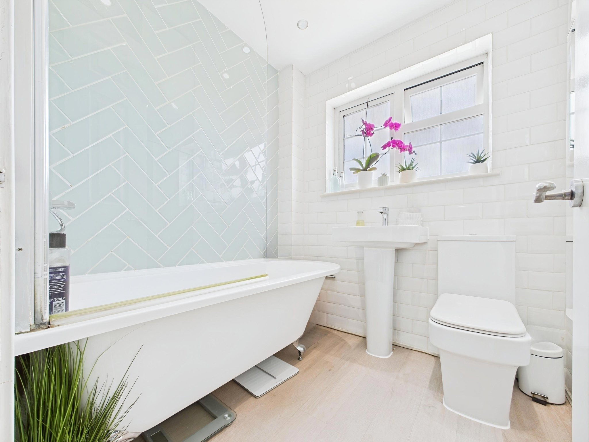 All bedrooms share a contemporary and stylish bathroom, which comprises of a modern claw foot bath with a shower over, a large wash hand basin and a low-level WC. The walls are finished in white and pale blue tiles which complement each other. The bathroom further benefits from a mirror fronted cabinet, shaver point and a heated towel radiator.