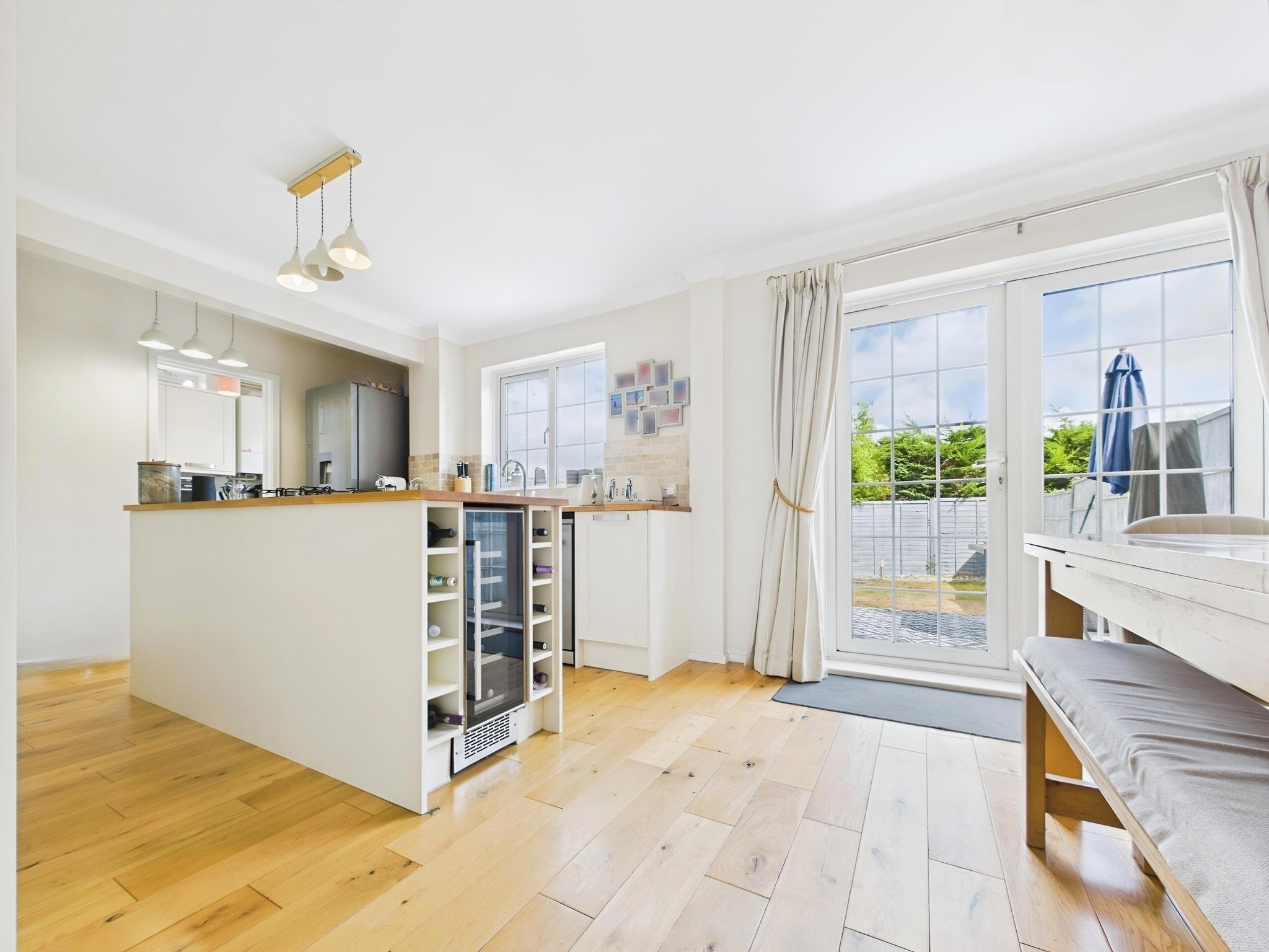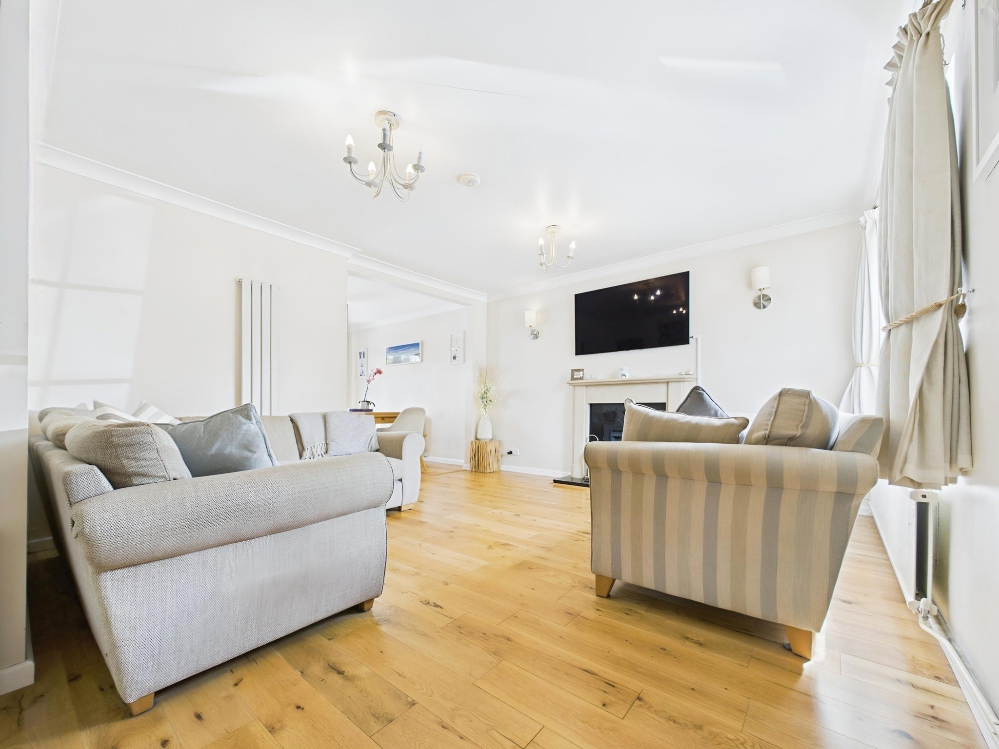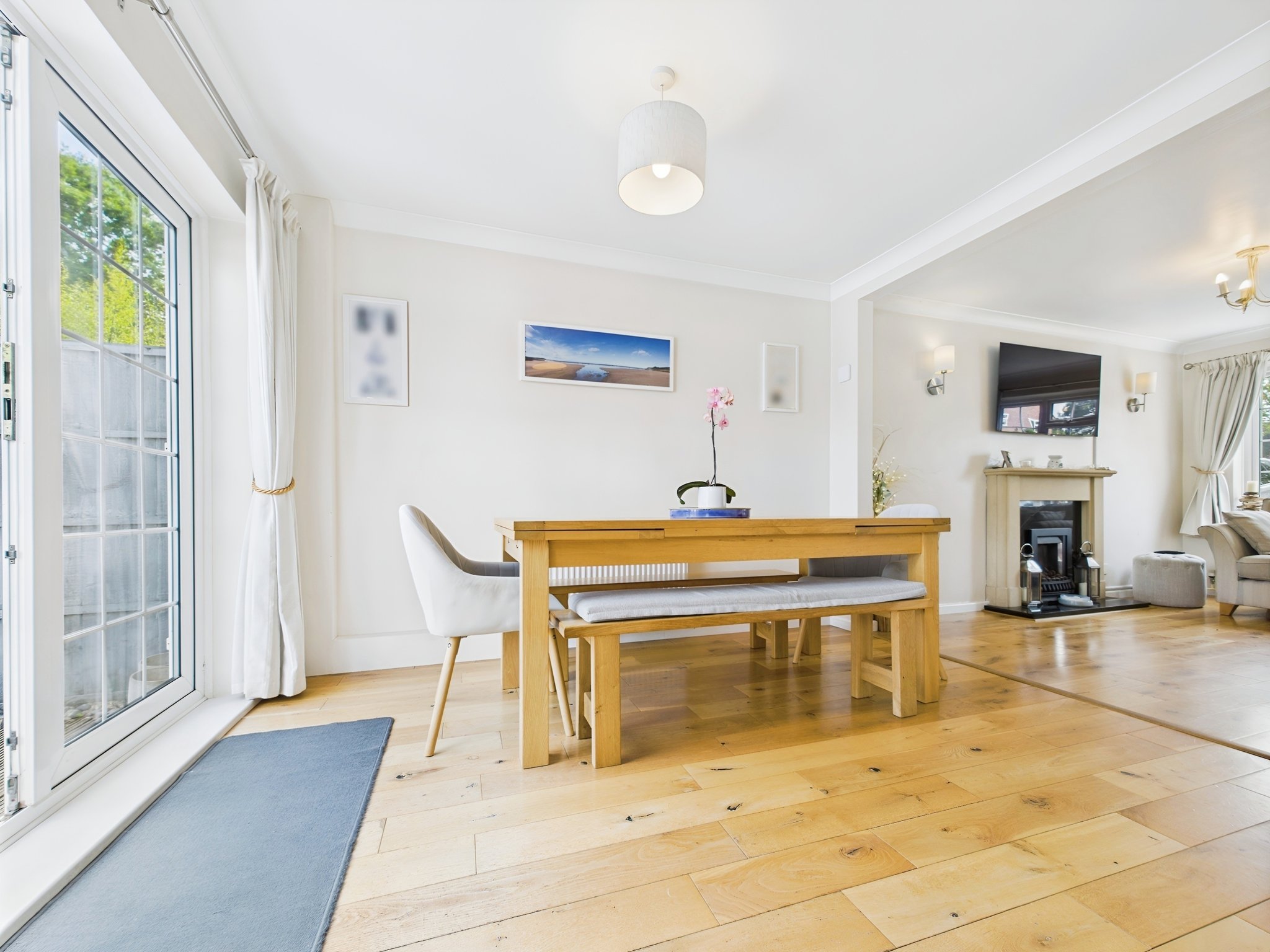 The beautiful kitchen diner offers views over the rear garden and presents French doors opening onto an area of decking offering a perfect space for gathering an entertaining. The stylish and well-equipped kitchen comprises of a range of matching wall and floor mounted units with a wooden worksurface over. There is the added convenience of an island, which houses a four-ring gas hob, whilst also providing additional storage space. With a built-in double oven, integrated microwave, space and plumbing for a dishwasher and appliance space for a fridge freezer, your culinary requirements are well and truly catered for.