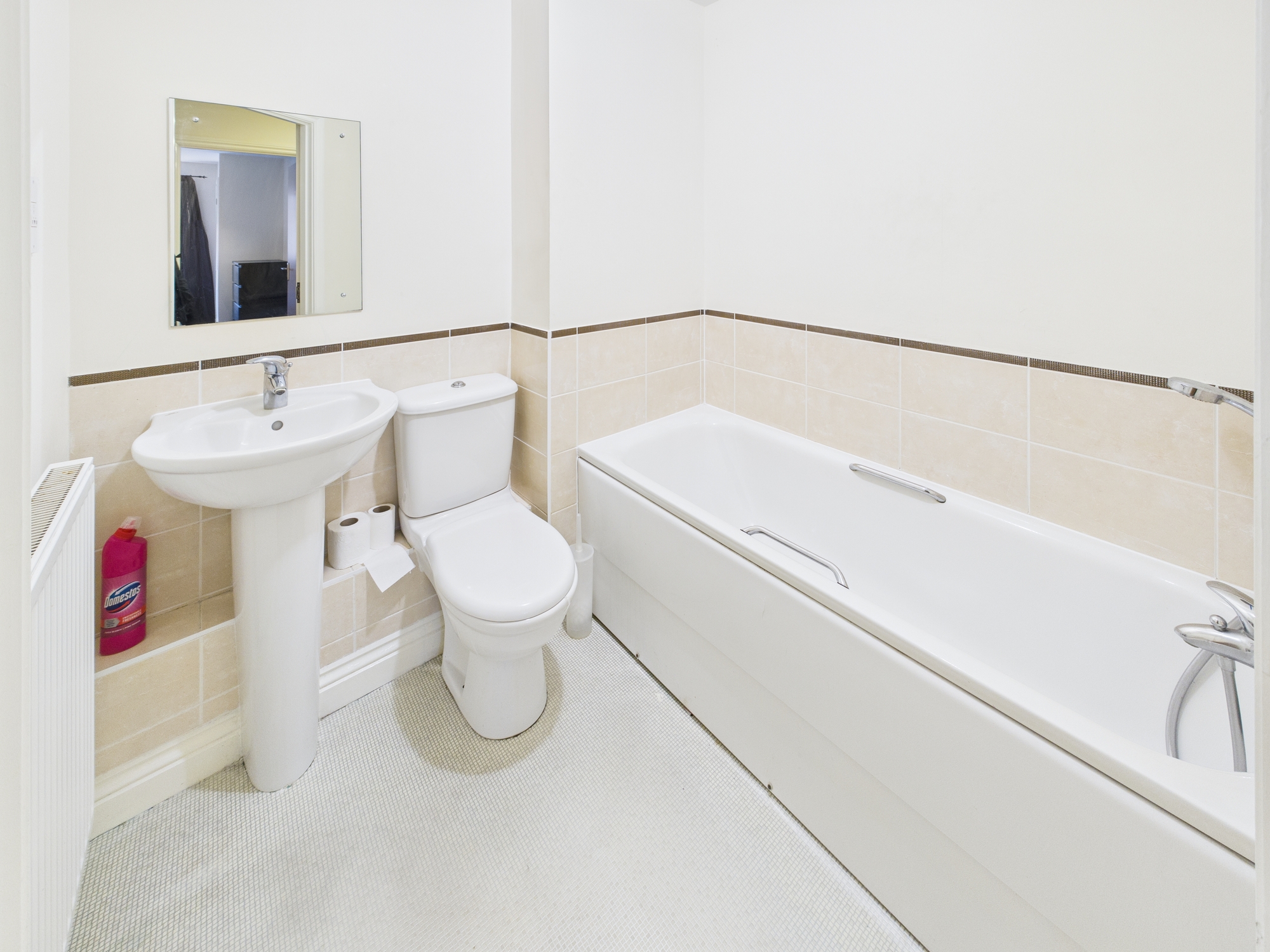 Bedroom two is a further good-sized double room with a window overlooking the communal grounds and a built in cupboard housing the gas-fired boiler. The bathroom is principally tiled and comprises a panel enclosed bath with a handheld shower attachment, wash hand basin and a WC.