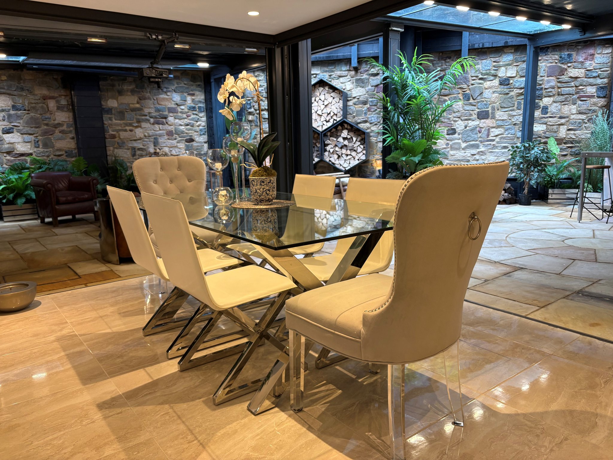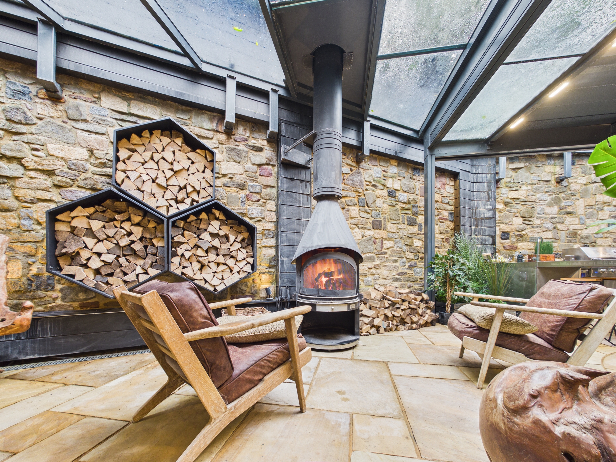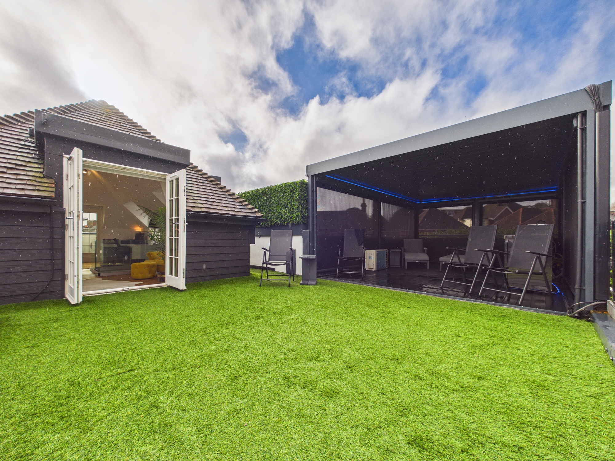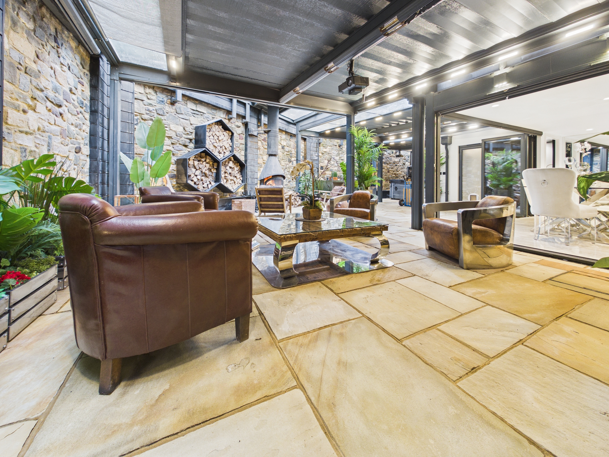 Two banks of bifold doors offer a seamless transition from indoor to outdoor living and open into the private, walled outdoor entertaining area, an impressive space that is perfect for hosting. Here you are treated to a masterful fusion of rustic charm with modern touches. At its heart sits a striking, log-burning stove and an outdoor kitchen with a mains gas powered barbecue. The crowning feature, a retractable, electric louvered roof with glazed inserts, lights and heating ensures year round usability. Fitted to the roof are two projectors with drop down screens to provide an outdoor cinema feature. A large hot tub and outdoor steam shower complete the luxury experience.
