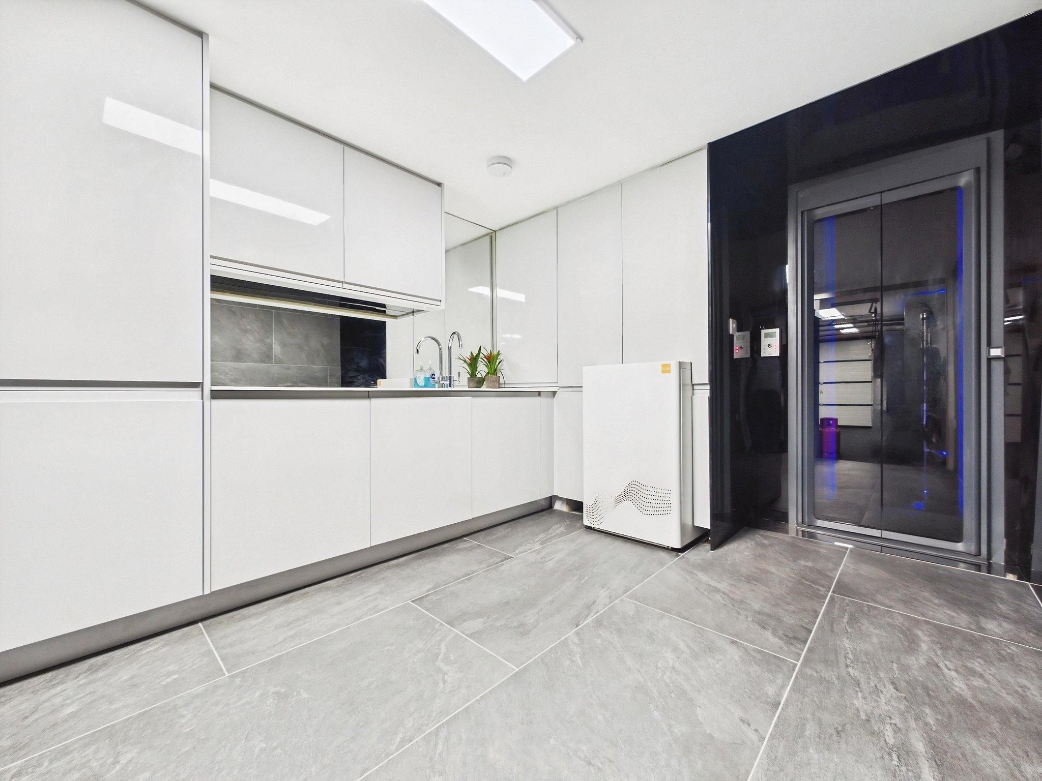 The well-appointed utility room is completed with high gloss units, washer/dryer, Corian worksurfaces, and access to the elevator. The elevator connects the principal floors of the home offering the ultimate sense of arrival and opening directly into the master bedroom dressing area for a truly luxurious living experience.