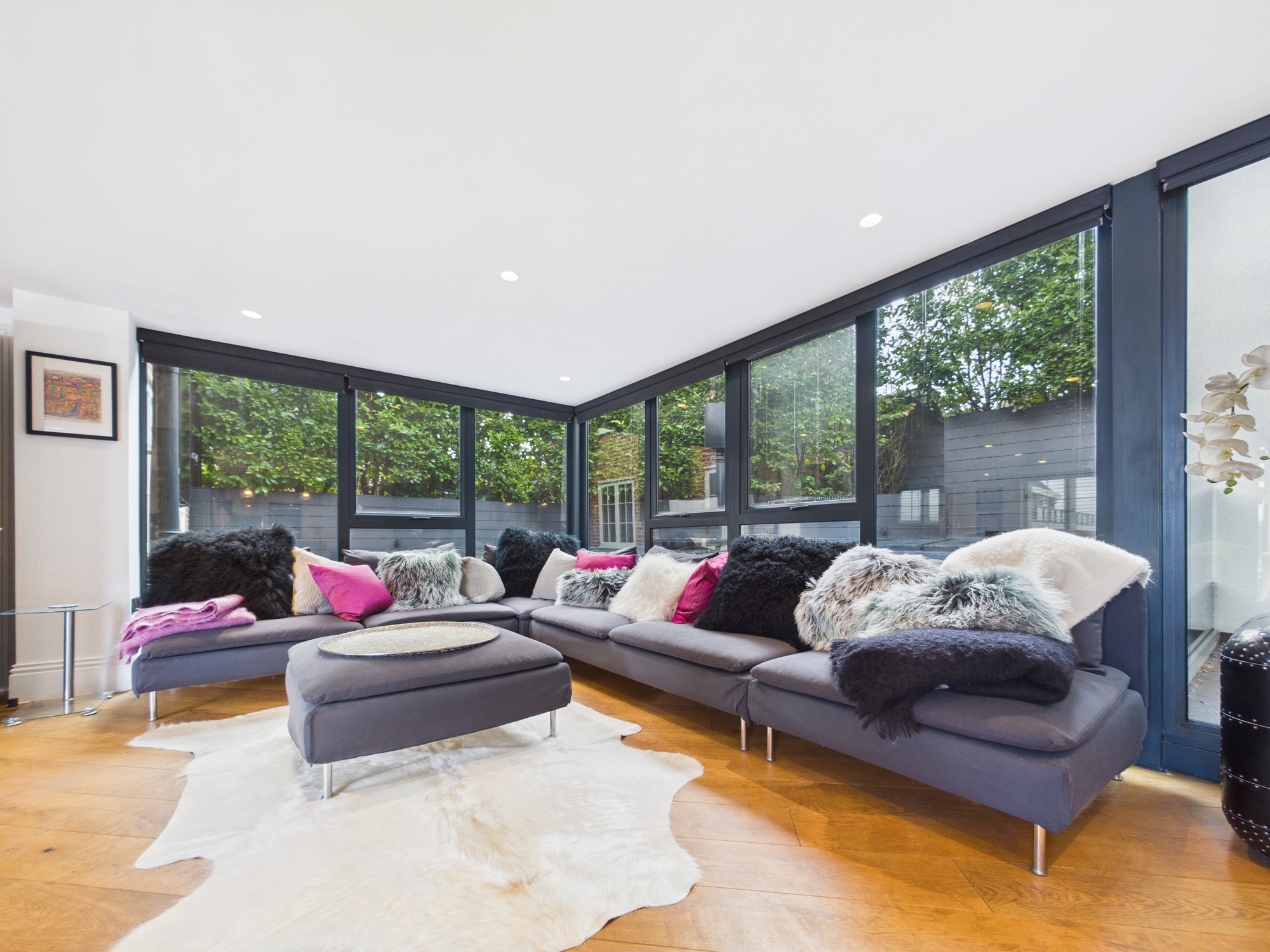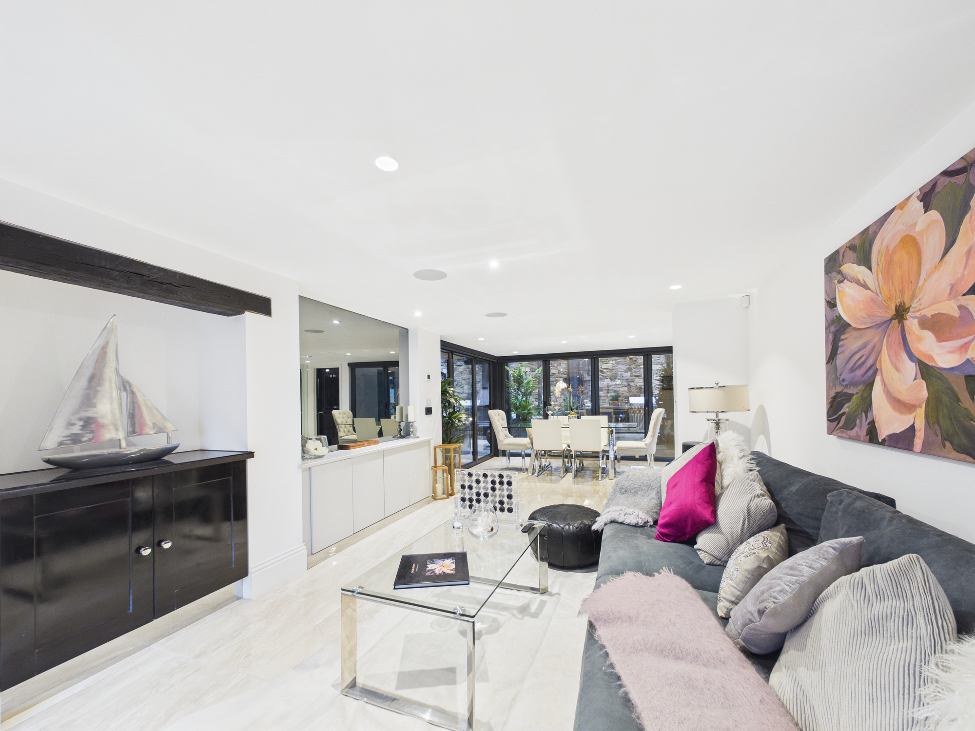 The kitchen is adorned with a comprehensive range of contemporary, high gloss units and an island with Corian worksurfaces. This well-equipped kitchen boasts state of the art appliances including a double oven, microwave, induction hob with extractor, fridge/freezer, dishwasher and a wine fridge. Bifold doors towards the rear of the room open to reveal a further balcony looking over the outdoor entertaining area. A door opens into a stylish cloakroom. Carefully crafted, the owners vision here is nothing short of spectacular, culminating in a fabulous space offering the perfect balance between timeless allure and modern elegance.