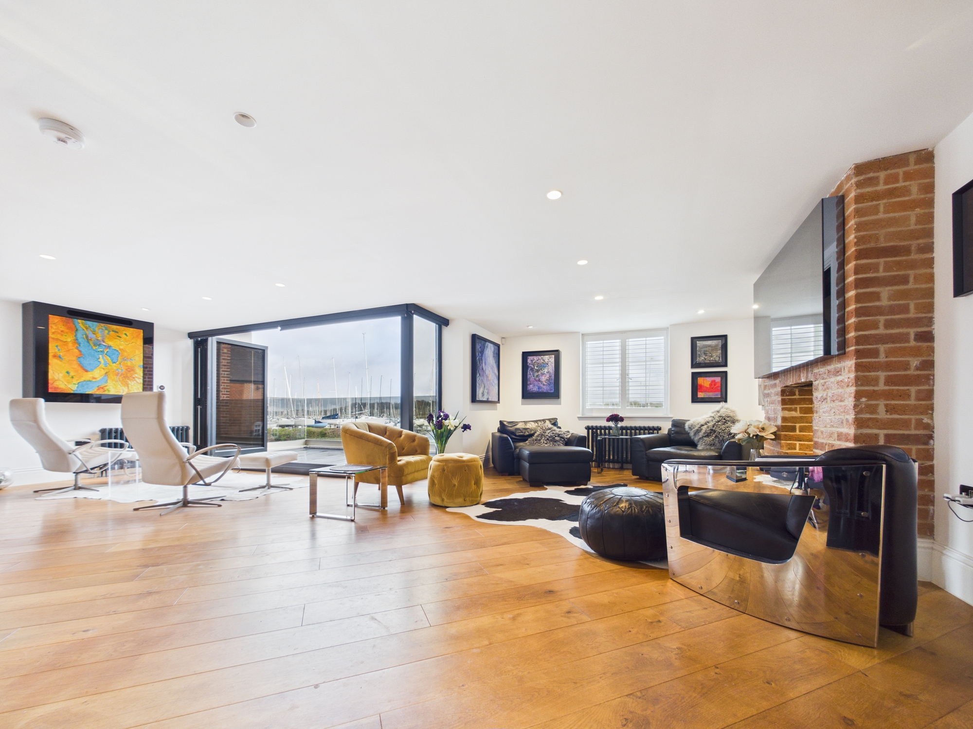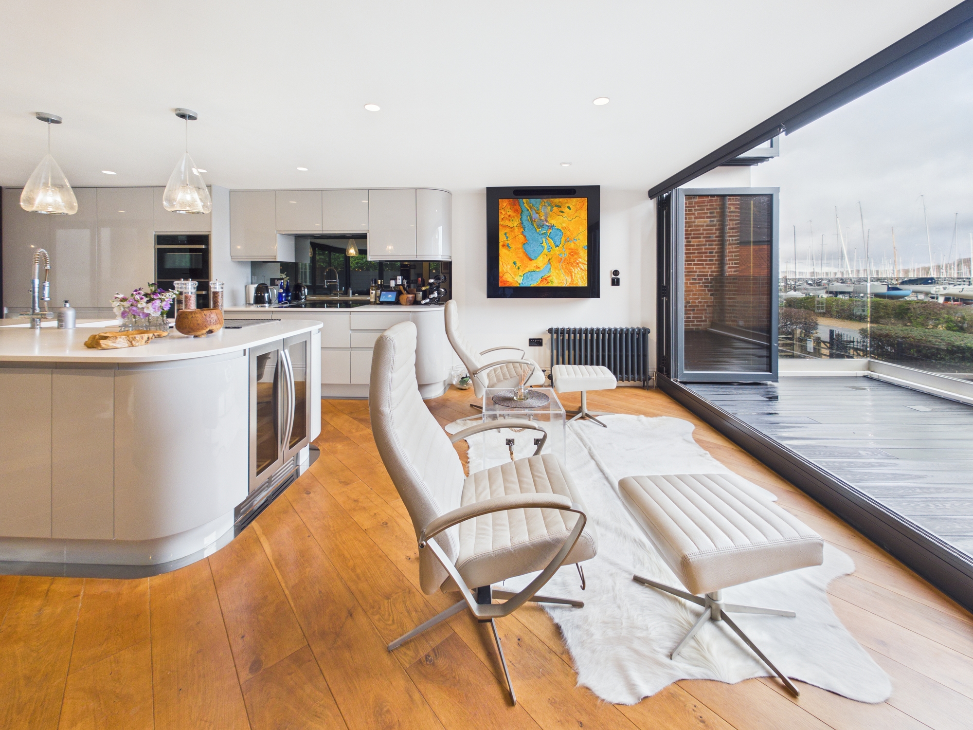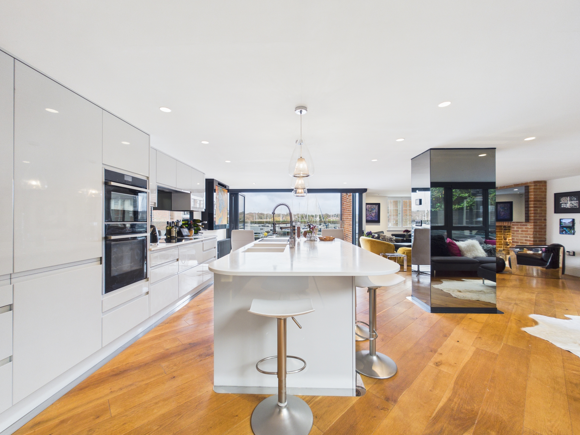The open plan kitchen/dining/living area is an expansive, light filled sanctuary with bifold doors to the front aspect opening to reveal a balcony from which you are treated to panoramic river views with an ever changing backdrop. Full length windows to the rear allow an abundance of natural light into the room. The living area boasts a beautiful brick fireplace, enhancing the cosy ambience.
