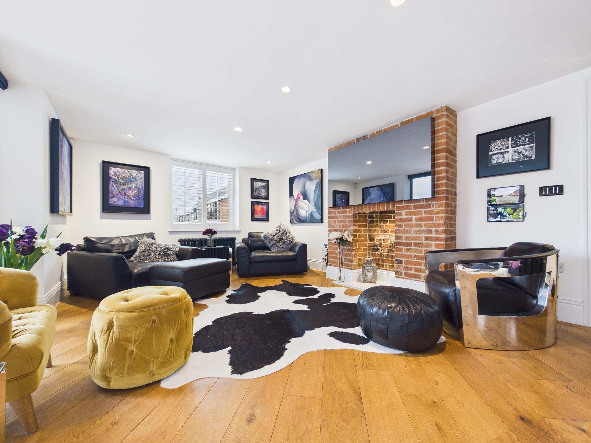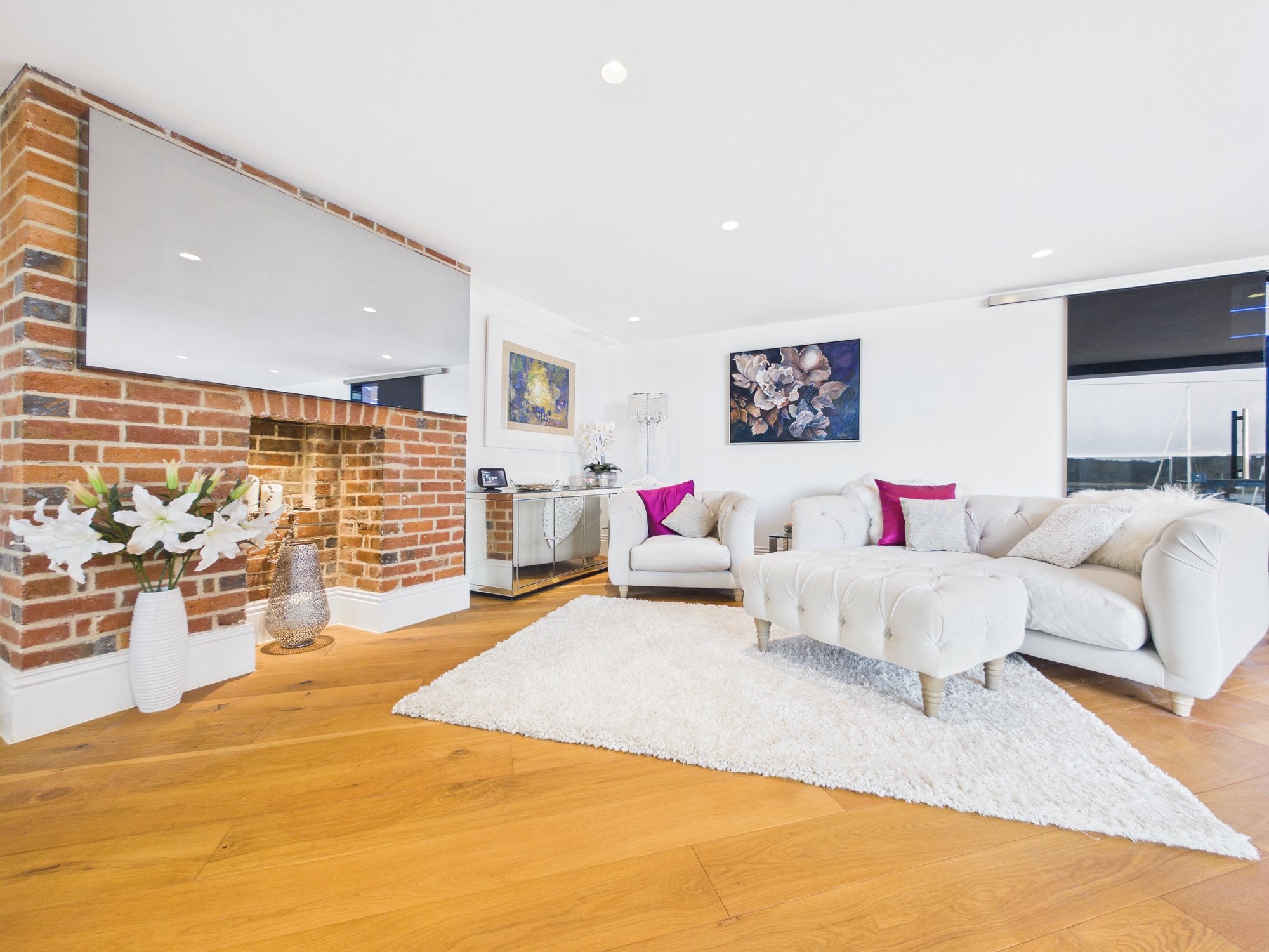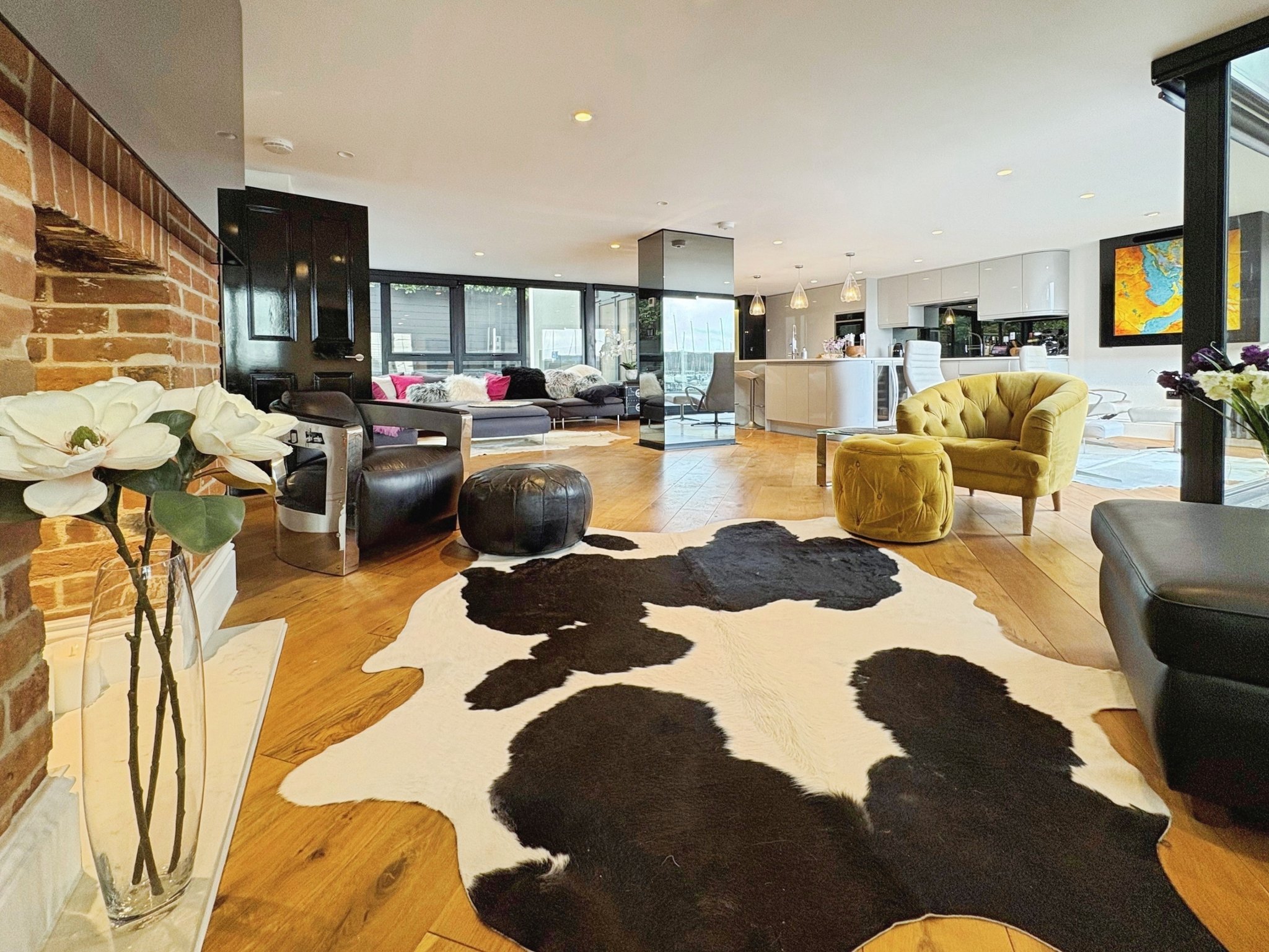 The open plan kitchen/dining/living area is an expansive, light filled sanctuary with bifold doors to the front aspect opening to reveal a balcony from which you are treated to panoramic river views with an ever changing backdrop. Full length windows to the rear allow an abundance of natural light into the room. The living area boasts a beautiful brick fireplace, enhancing the cosy ambience.