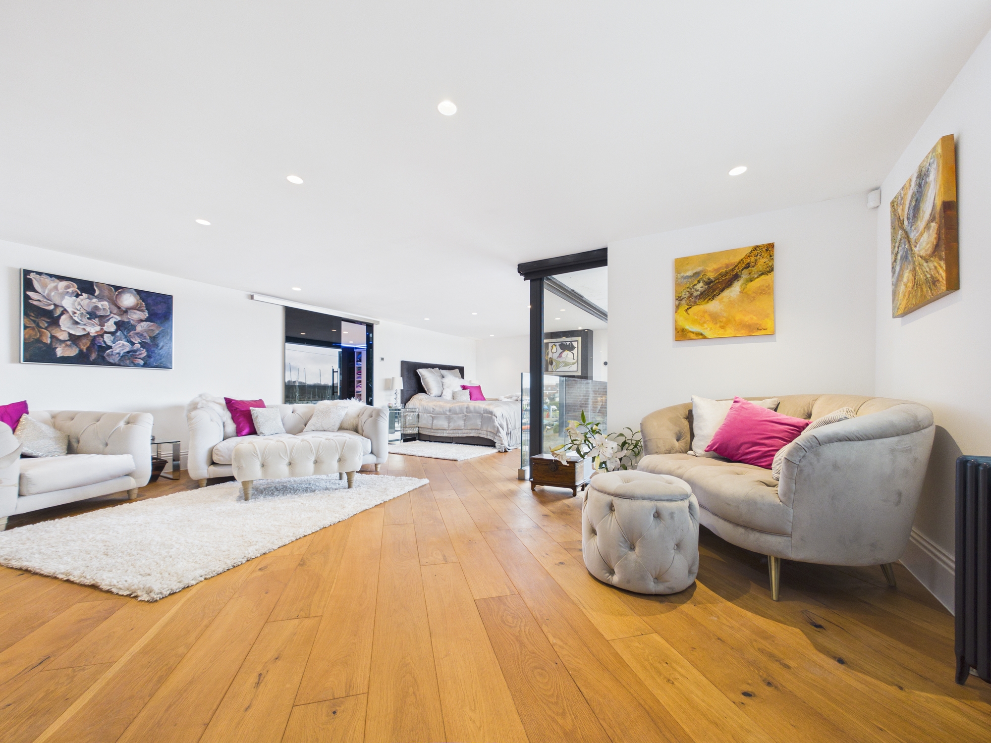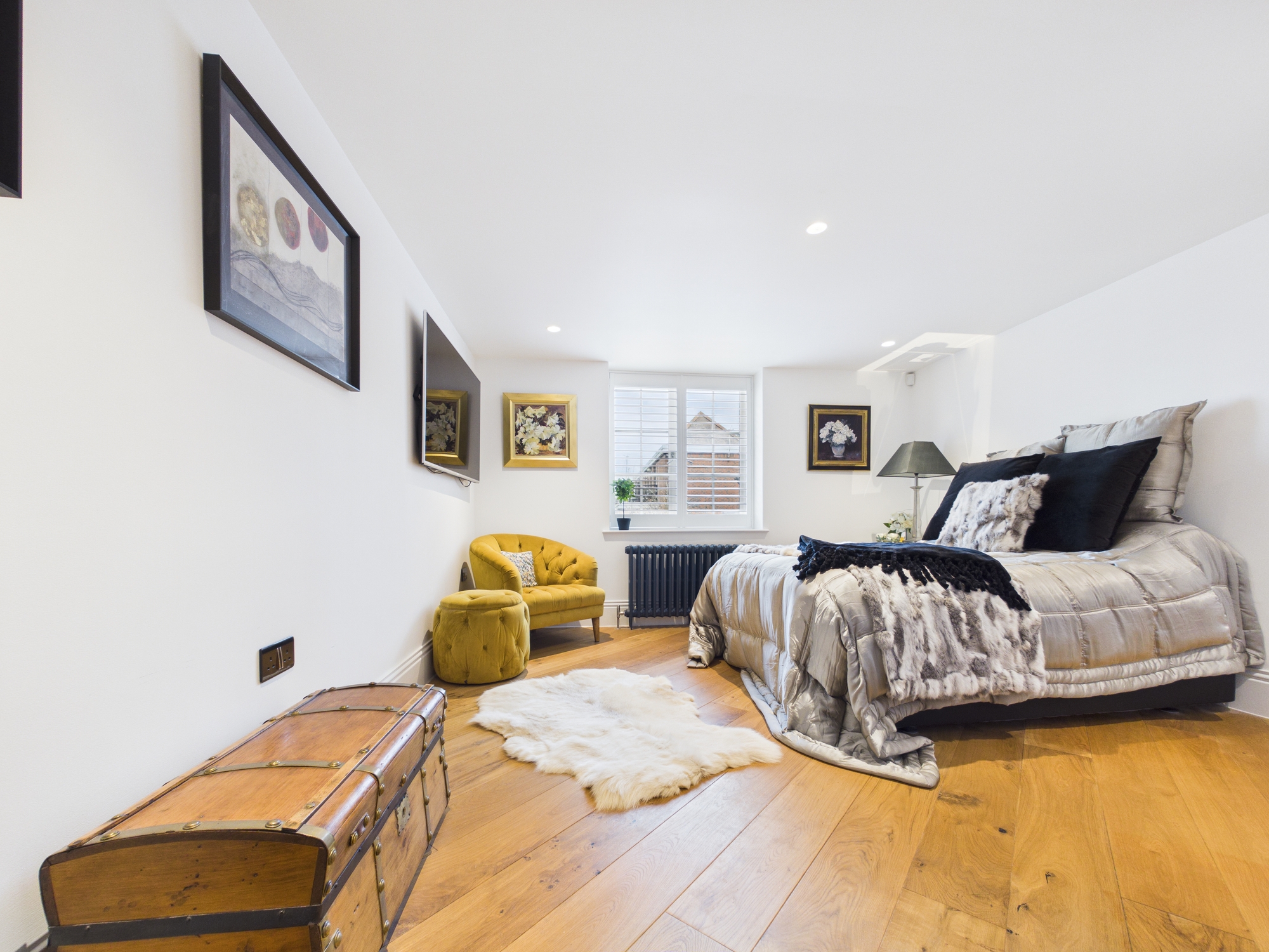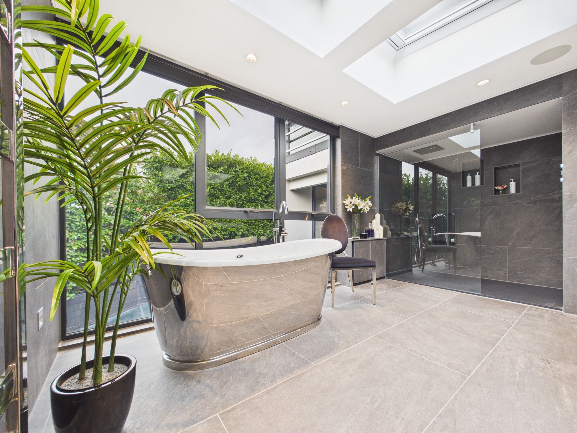 The en-suite is bathed in natural light with expansive floor-to-ceiling glazing and two skylights. At its heart sits a freestanding bathtub, an inviting centrepiece that evokes a spa-like retreat. Stone tiles in soft grey tones wrap the walls and floors, delivering a cohesive, modern aesthetic flowing into the walk-in shower area. Floating vanity wash hand basins, a WC and a mirror TV complete the design. Two heated chrome towel radiators add both comfort and practicality.