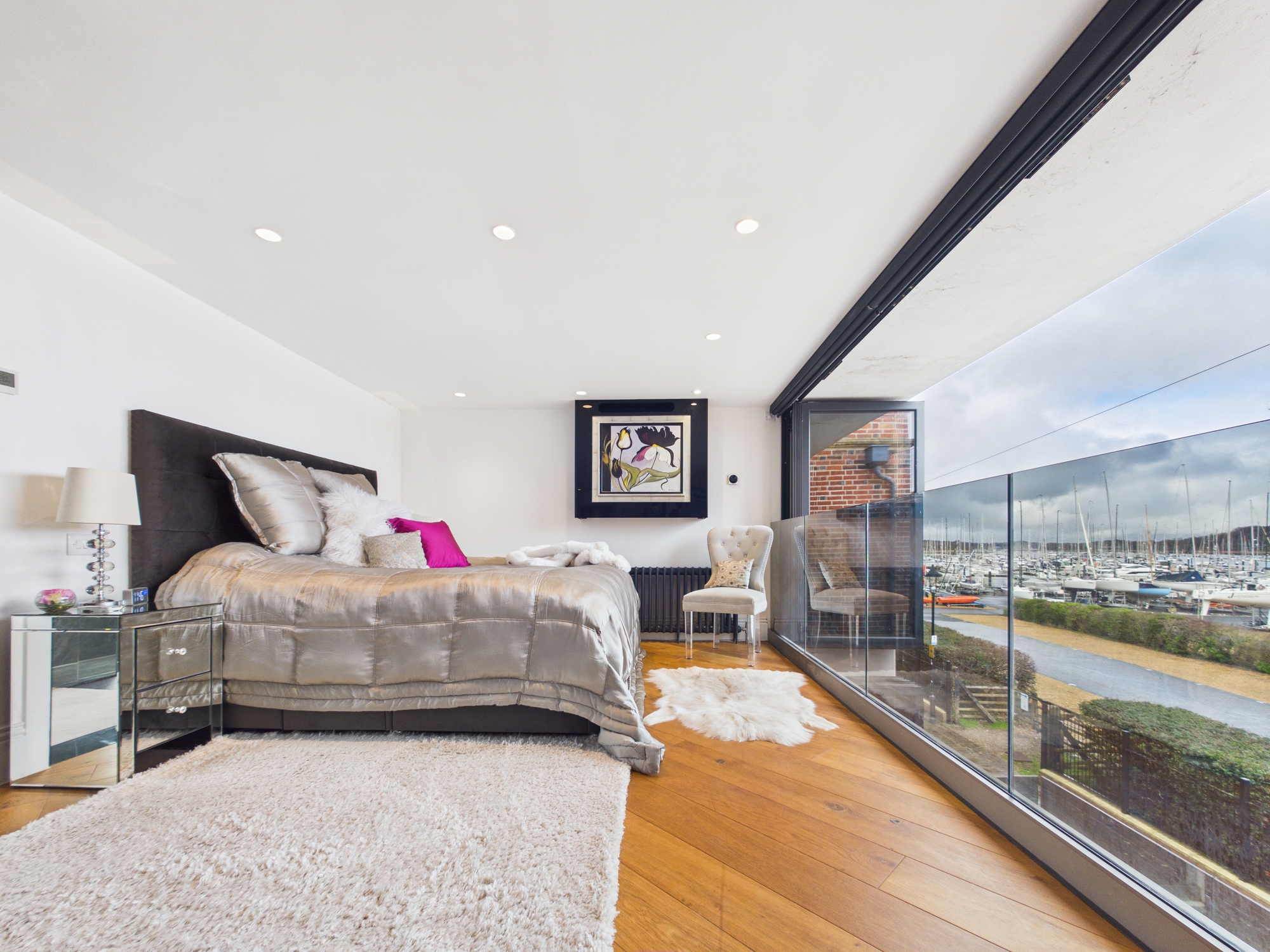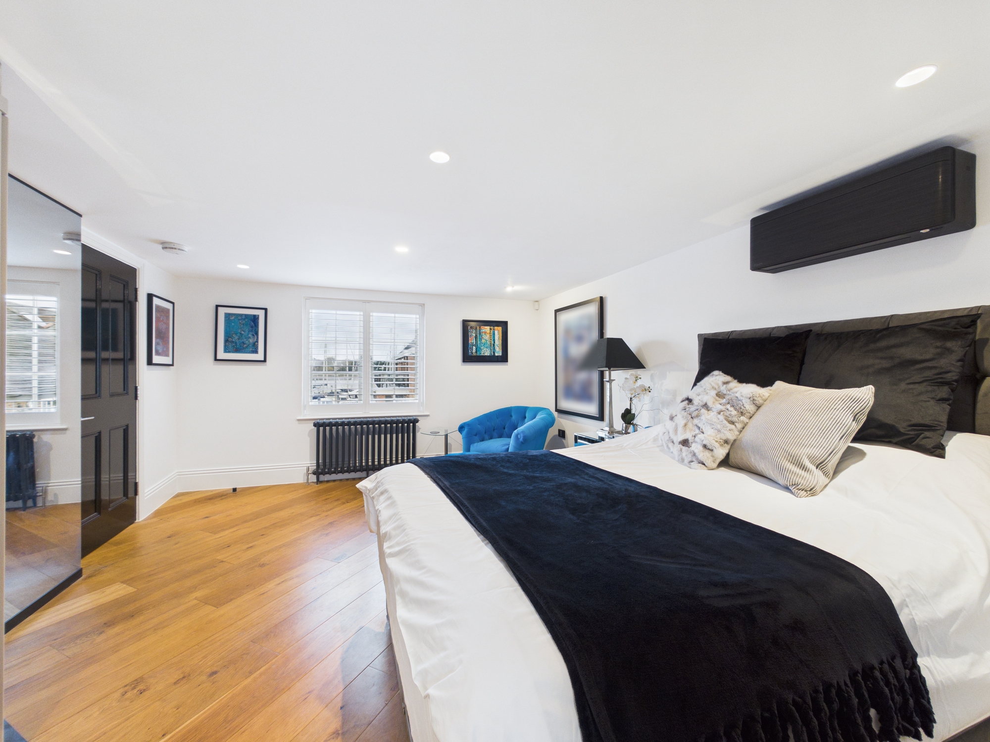 This floor hosts a further spacious double bedroom with a window offering views of the river, bespoke fitted wardrobes, mirror TV and a contemporary en-suite.