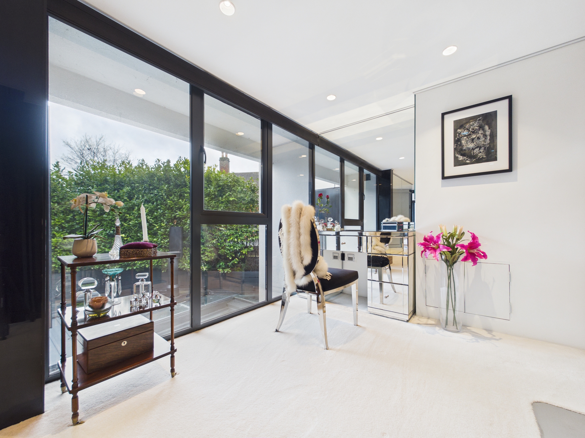 Adding a rare level of convenience, the dressing room benefits from direct access via the elevator, ensuring both privacy and ease of living. Bespoke, full-height fitted cabinetry offers extensive, streamlined storage, and the mirrored vanity area is perfectly positioned beside the window. Thoughtfully designed to maximise both style and practicality, the layout allows for effortless organisation and flow.