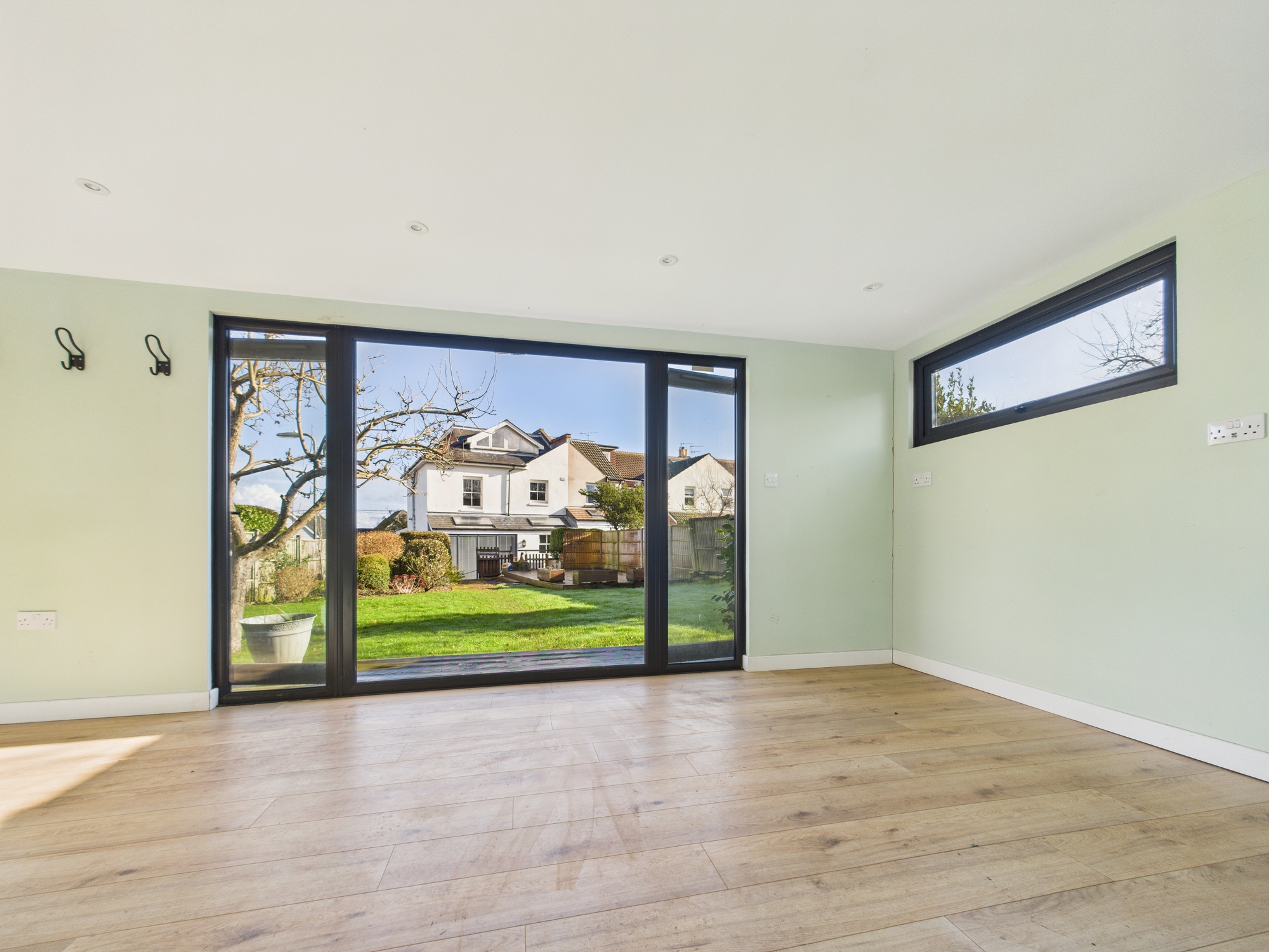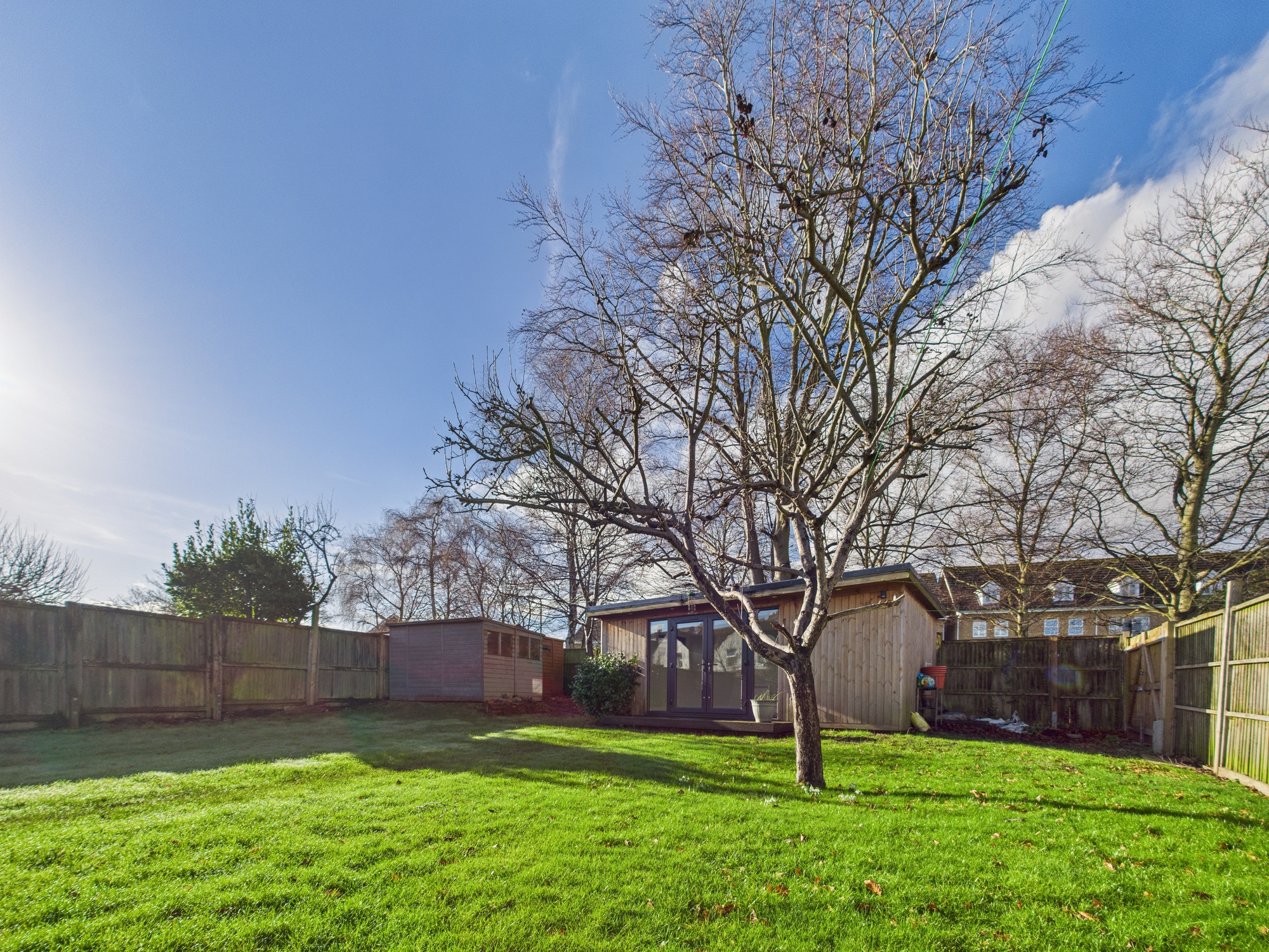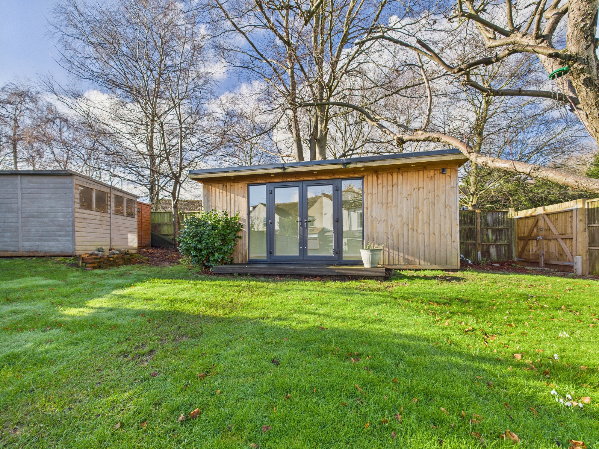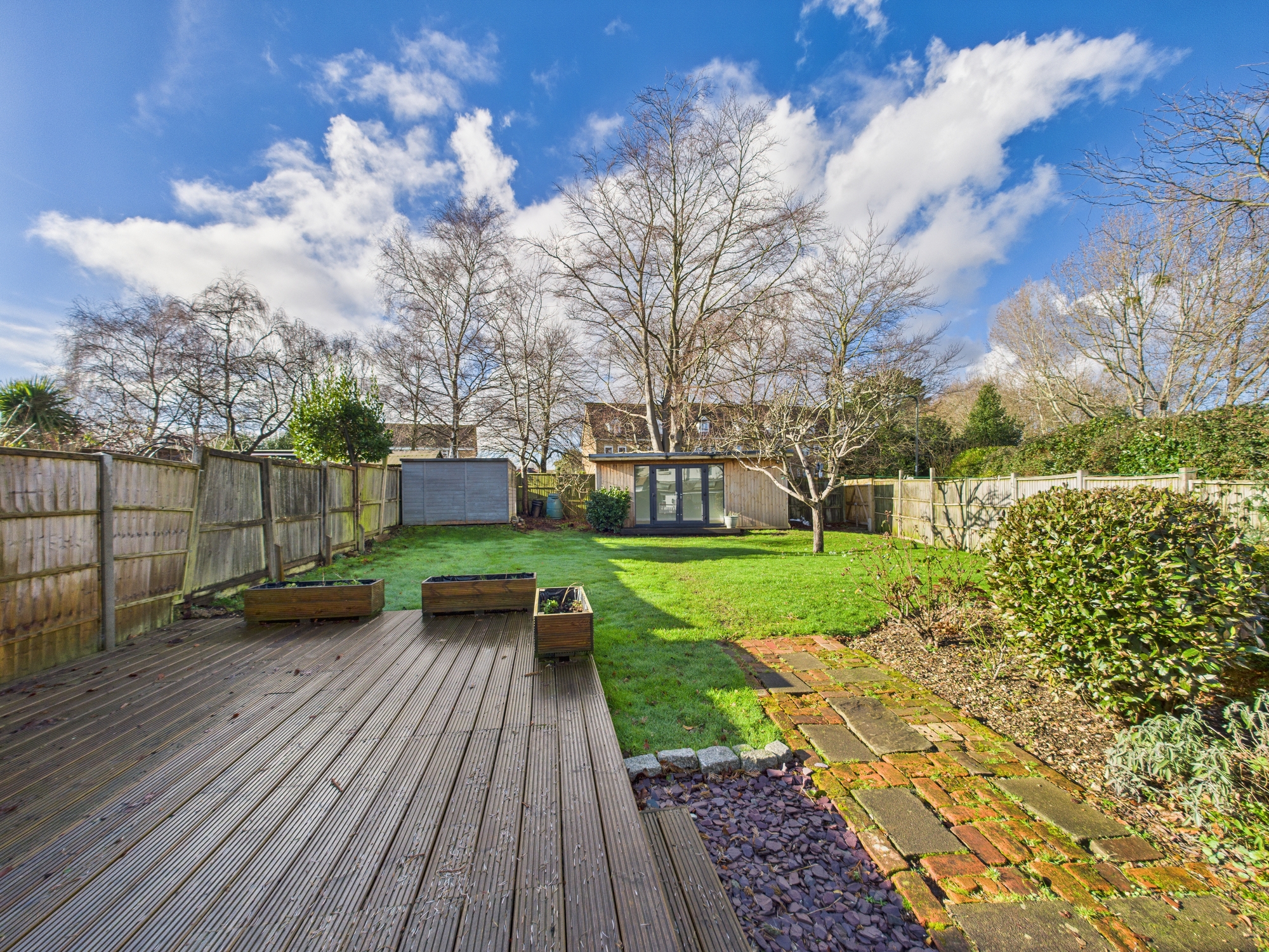 The enclosed rear garden is largely laid to lawn with an area of raised decking providing a lovely spot for outdoor entertaining and al fresco dining. At the foot of the garden is a timber shed, offering useful storage, and a fantastic garden office. The garden office benefits from power, lighting and internet, and could be used for a number of purposes. There is a store to one side.