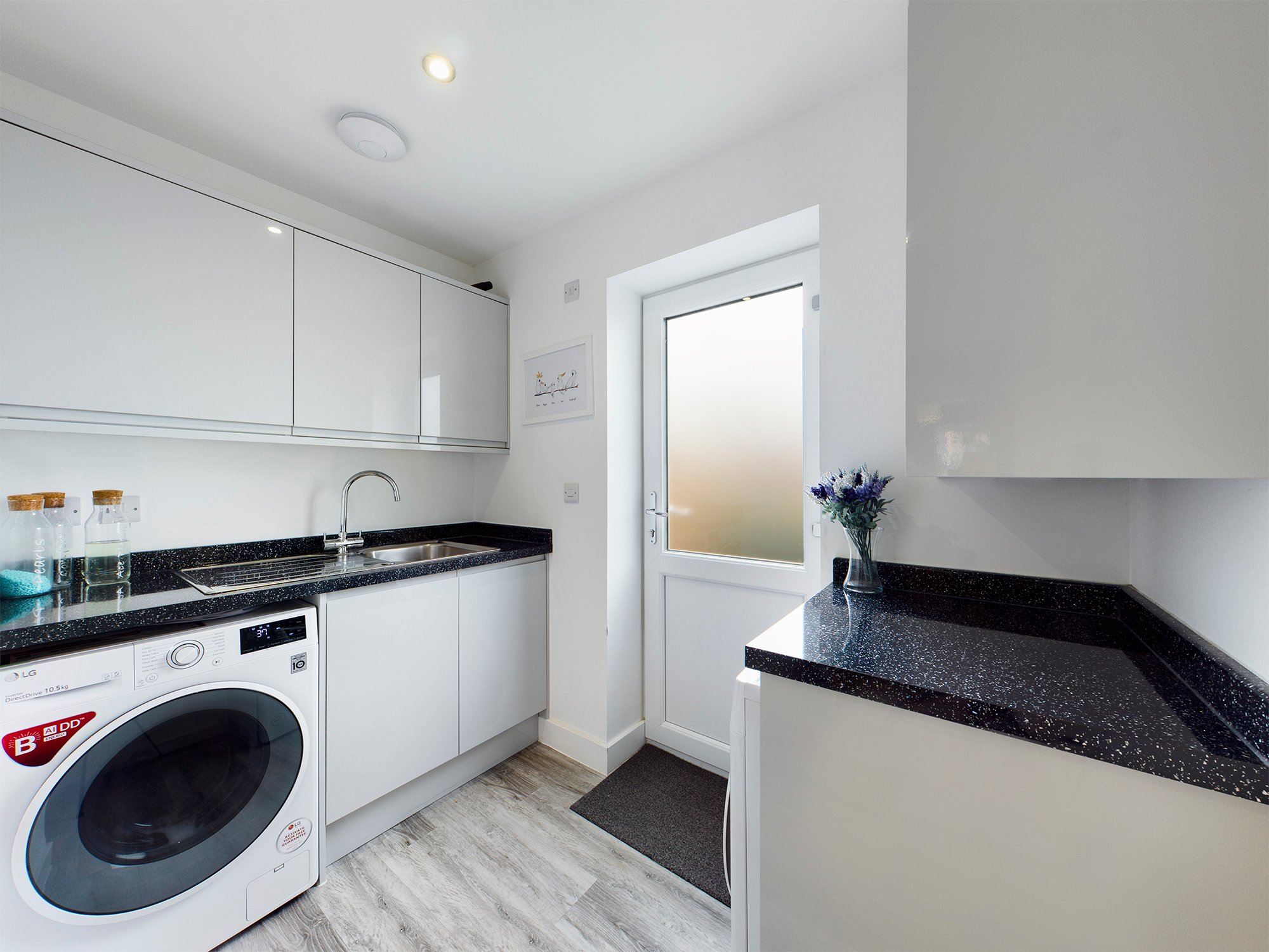 Smooth plastered ceiling with recess spot lighting, high gloss wall and floor mounted units with a square edge work surface and matching upstairs. Stainless steel sink and drainer, plumbing for washing machine and tumble dryer. Cupboard housing the Glo-worm boiler. Double glazed door opening to the side of the property and to the rear garden.