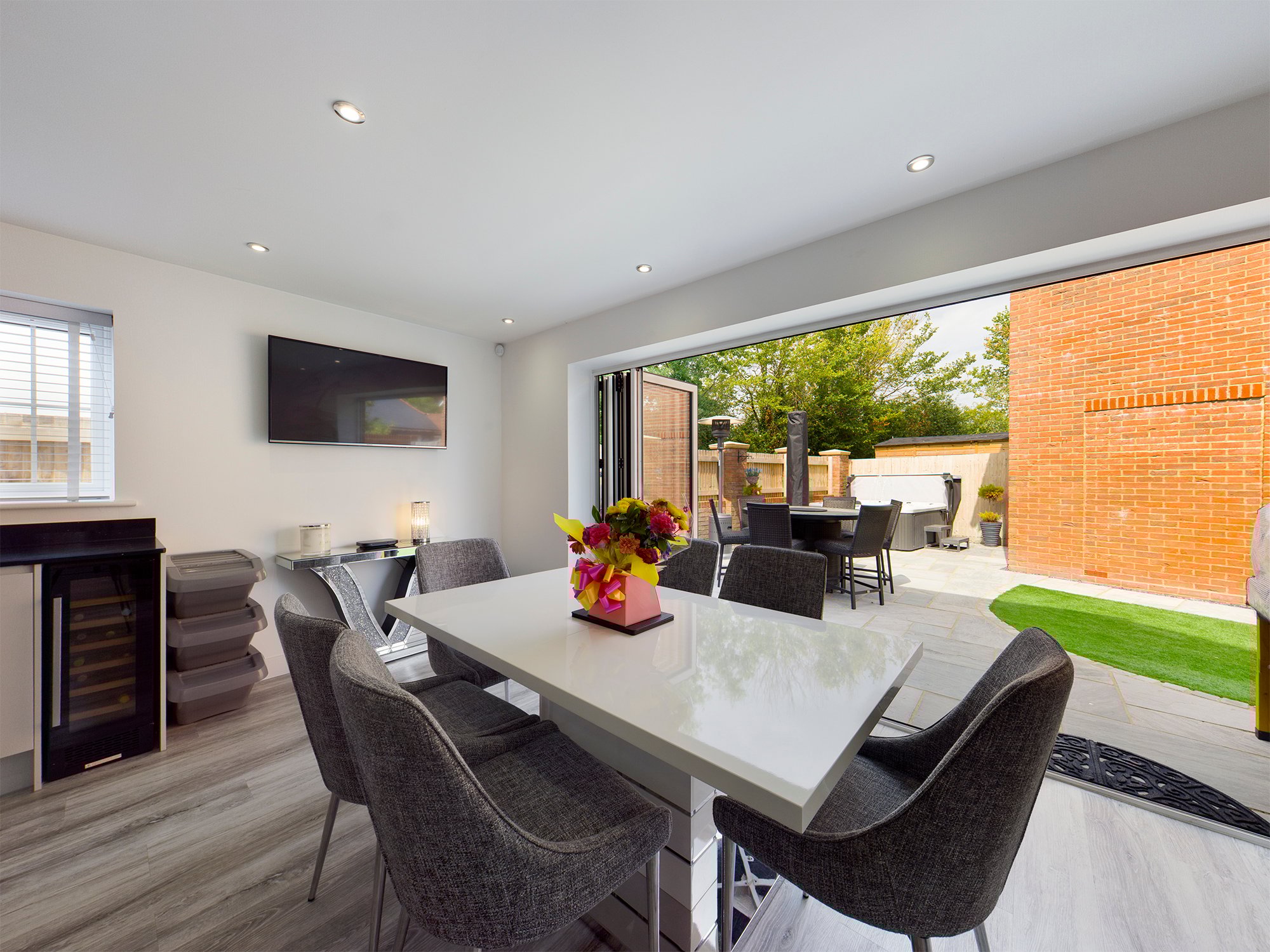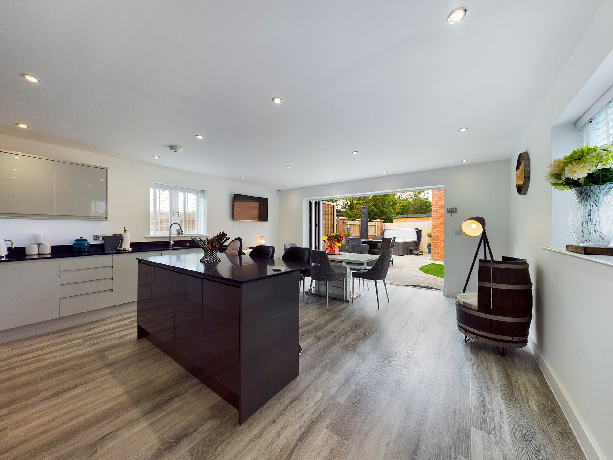 Smooth plastered ceiling and recess spot lighting. Double glazed UPVC windows to both sides of the room and aluminium bi fold doors to the garden. High gloss wall and floor mounted units, granite work surface. All appliances are NEFF which includes, eye level oven, induction hob, extractor hood, integrated dishwasher, wine cooler and fridge freezer. The kitchen also benefits with a central island with further storage. Undermounted stainless steel sink with engraved drainer and a multi-function spray tap . Laminate floor covering, ample power points and wireless docking station.
