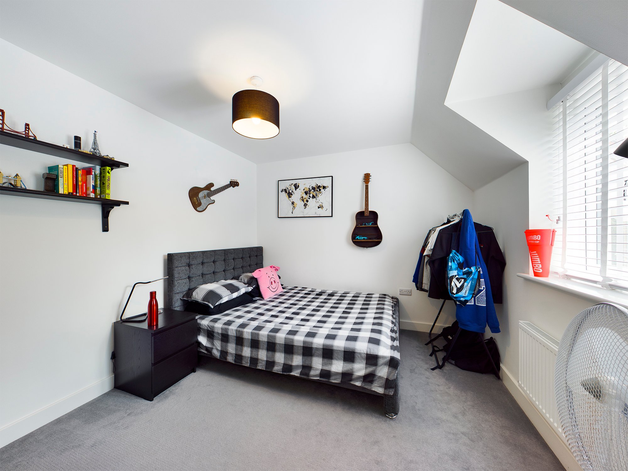 Smooth plastered sloping ceiling, double glazed UPVC window to the rear elevation, ample power points and radiator.