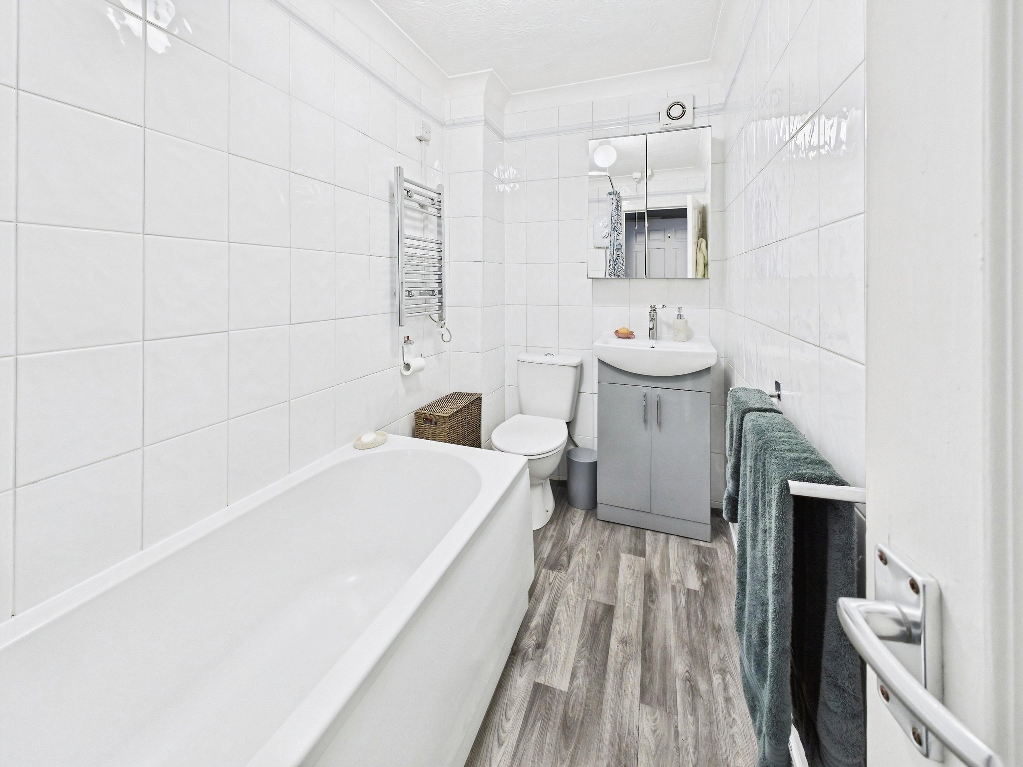 The bathroom presents fully tiled walls and comprises a panel enclosed bath with an electric shower over, vanity wash hand basin and a WC.