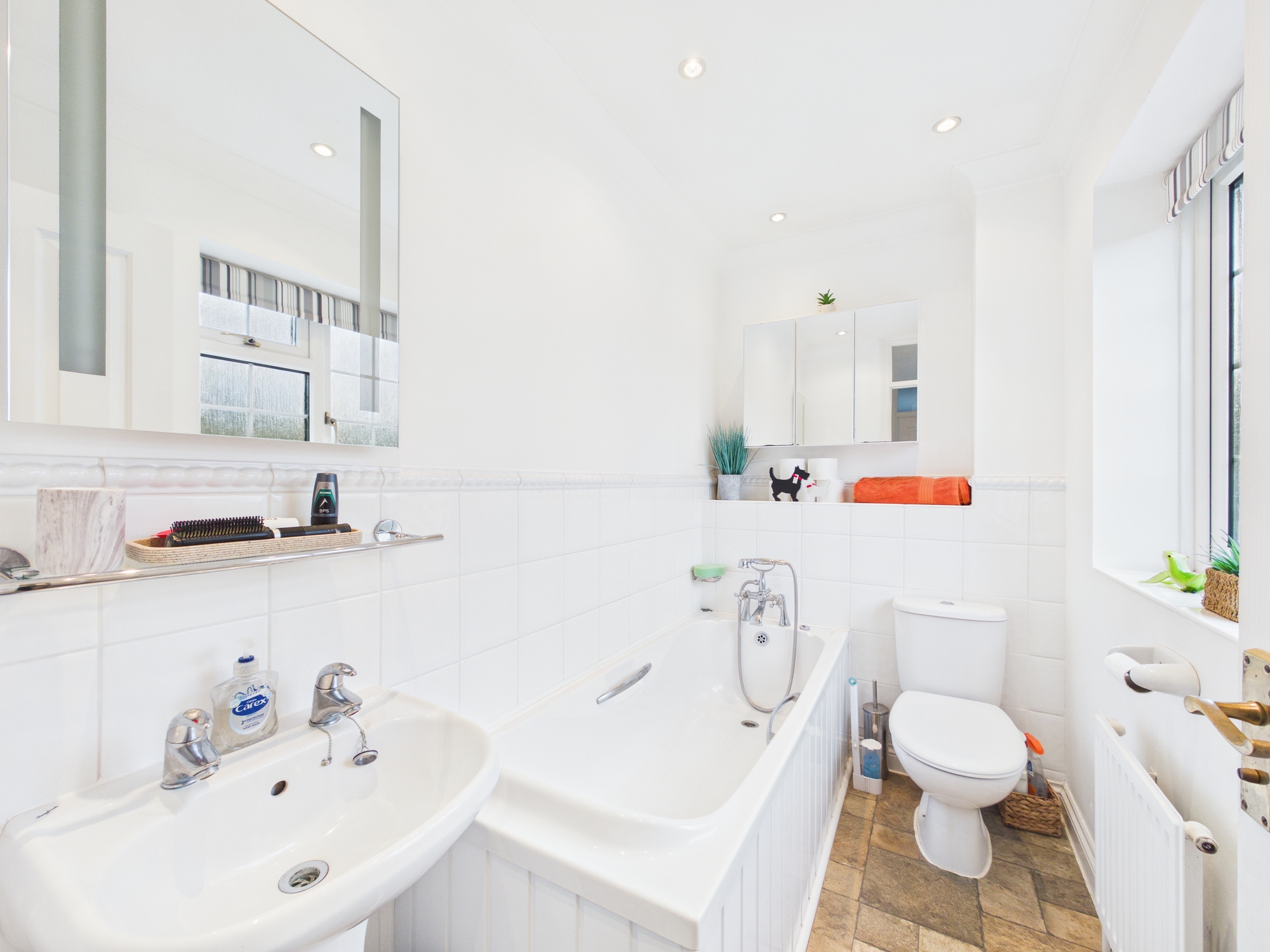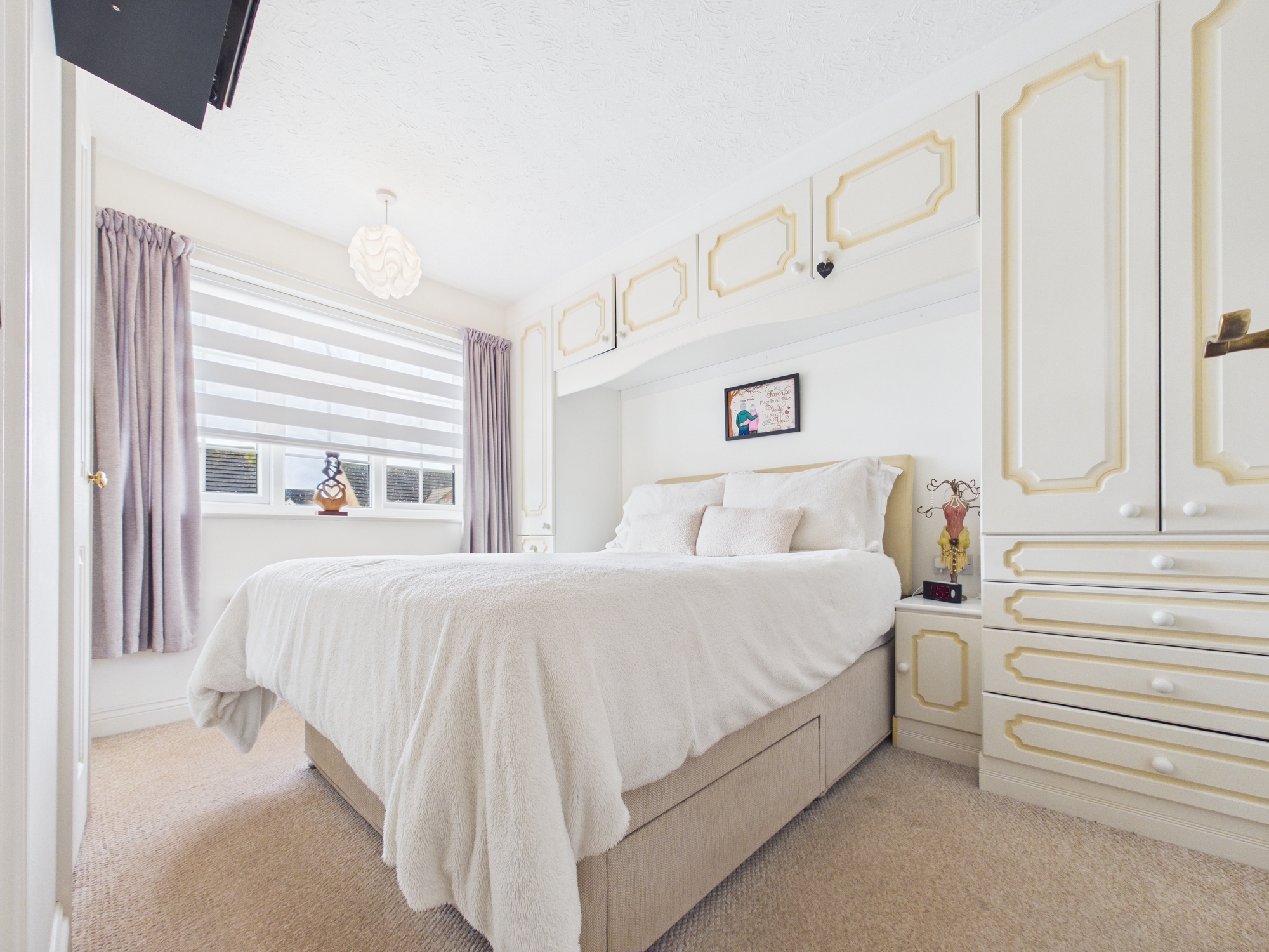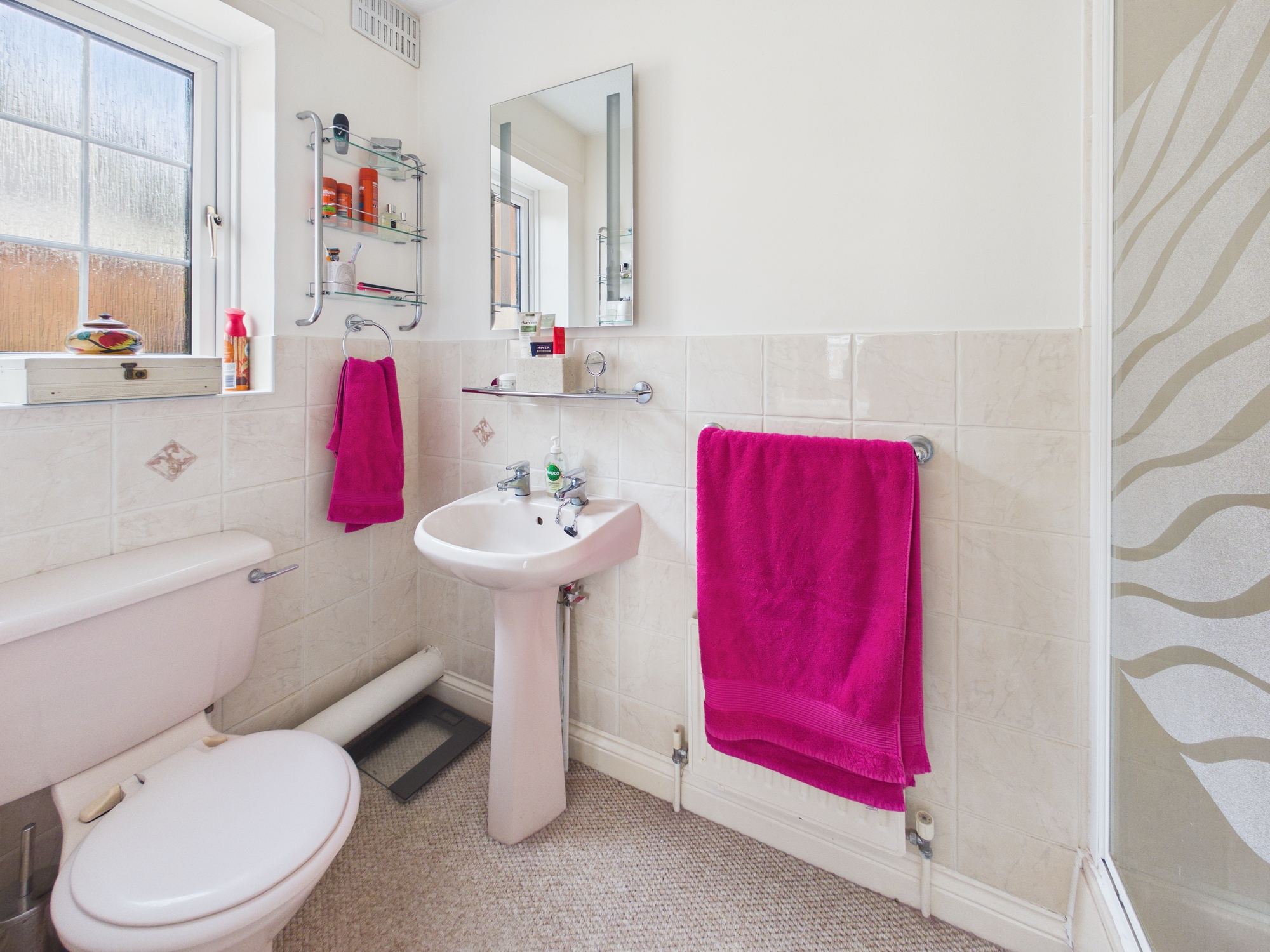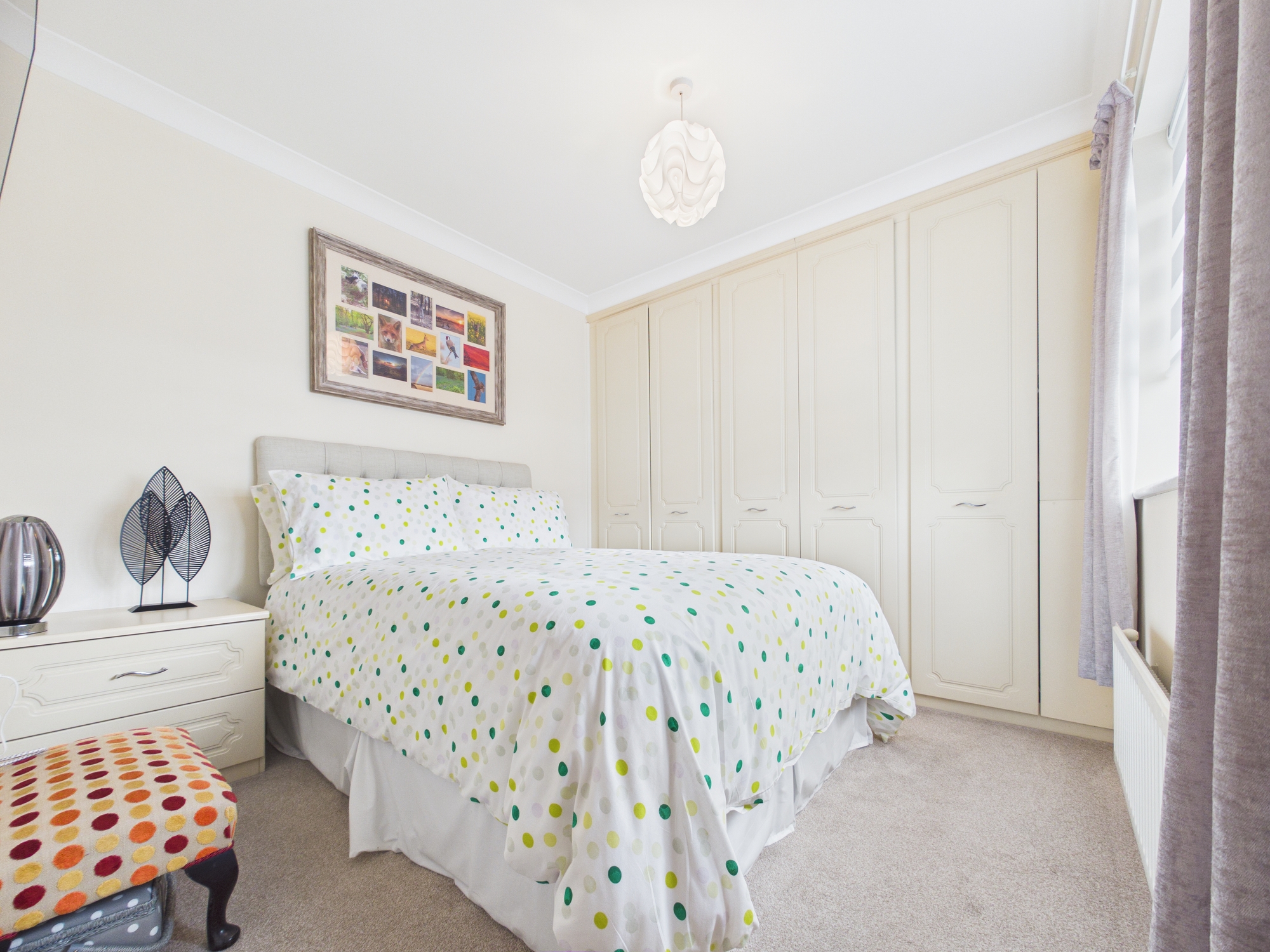 Ascending to the first floor, the landing benefits from a rear elevation window and offers doors to all rooms. There is a door to the linen cupboard and a loft access point, with a pull-down ladder, allowing access into the partially boarded attic space. Bedroom one offers a front aspect window, a double fitted wardrobe and a series of fitted furniture including, wardrobes, drawers and overhead lockers. This bedroom boasts the added convenience of an en-suite comprising a shower cubicle, wash hand basin and a WC. Bedroom two, a further double, presents a rear elevation window offering views over the garden and fitted wardrobes to one wall providing plentiful storage. Bedroom three benefits from a rear aspect window and is currently being utilised as an office. This room would equally make a delightful child’s bedroom or nursery. The family bathroom comprises a panel enclosed bath with a telephone style shower attachment, wash hand basin and a WC. There is a front elevation obscured window.