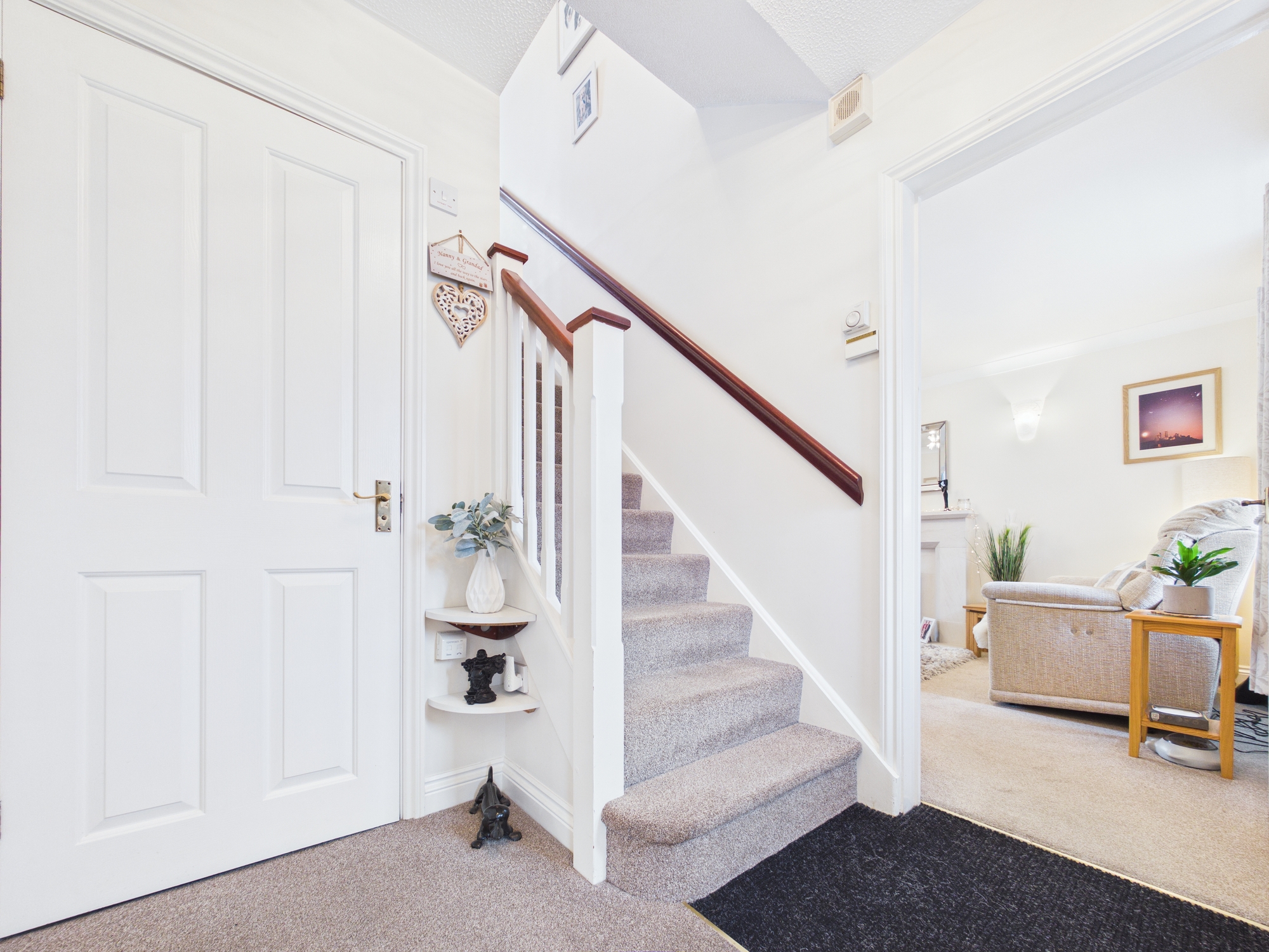 The property is approached via a paved footpath leading to the entrance door under a canopied porch. The front garden is largely laid to lawn. A driveway leads to the garage benefitting from an electric roller door to the front aspect and a pedestrian door to the rear. There is power, lighting and boarding in the eaves providing useful storage space.